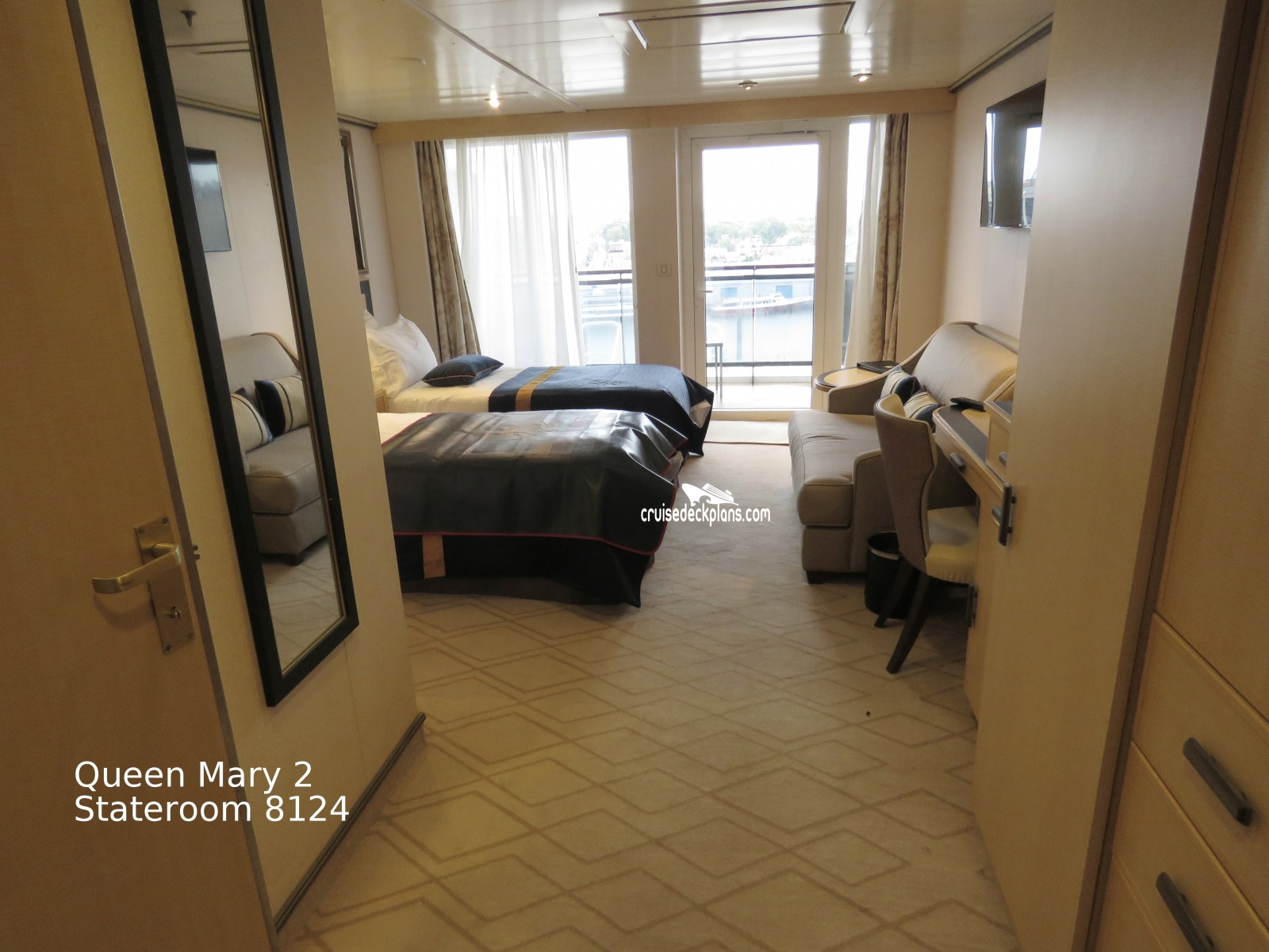 Queen Mary 2 Balcony cabin number 8124 ACTUAL videos and/or pictures, floor plans, diagrams and detailed features including a deck image of the actual location on the Queen Mary 2 ship for cabin 8124. Cruisedeckplans.com has 75,092 different (staterooms) cabins that have actual cabin pictures and/or cabin videos taken by real cruisers. That is plenty of coverage to provide you with a good sampling of all the different cabins on cruise ships. Take a minute and notice the breadcrumb menu above. This is a quick easy way to navigate our website. You can also use the menu above for menu items specific to the Queen Mary 2 cruise ship.