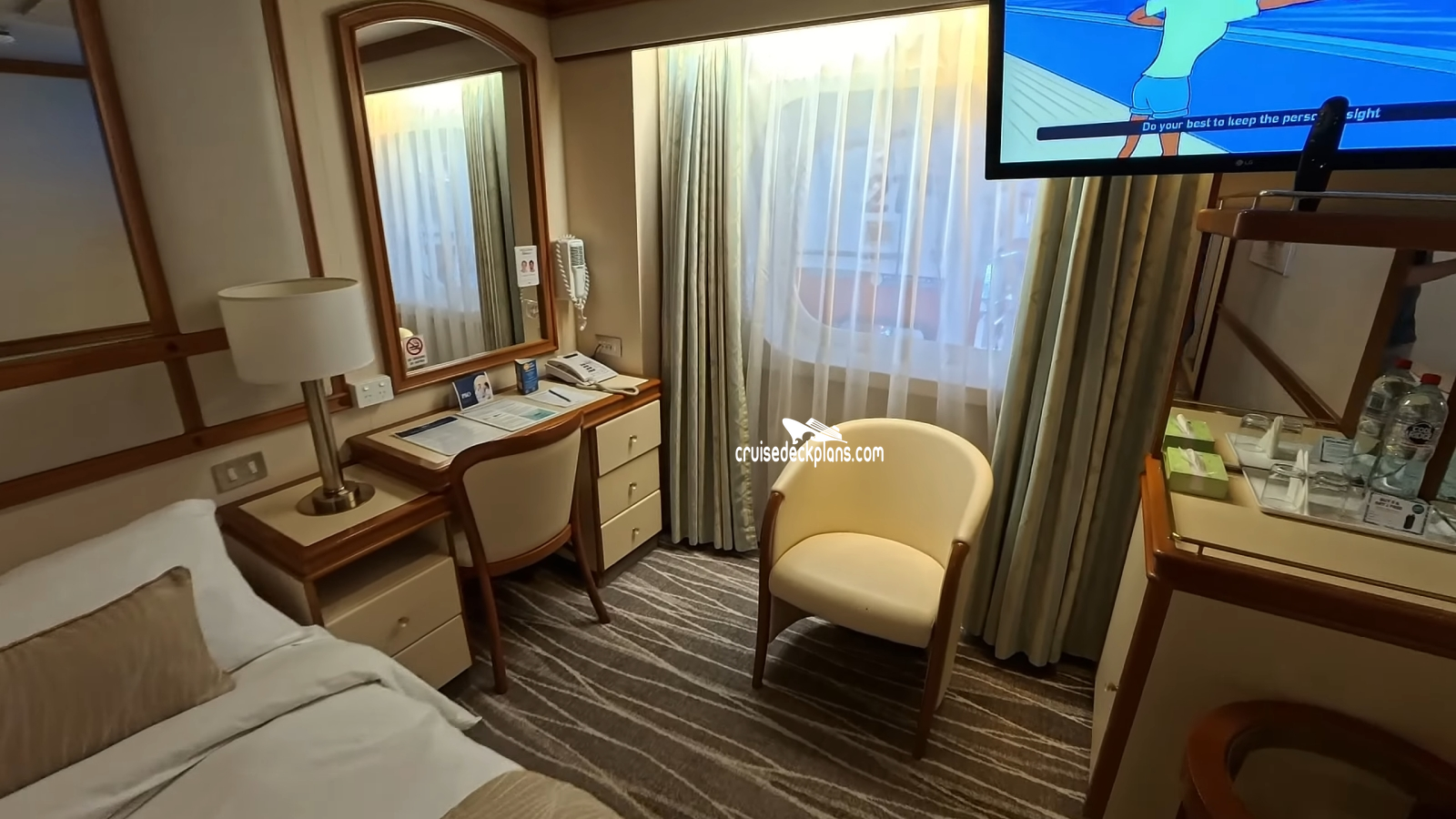 Carnival Adventure Oceanview cabin number 8625 ACTUAL videos and/or pictures, floor plans, diagrams and detailed features including a deck image of the actual location on the Carnival Adventure ship for cabin 8625. Cruisedeckplans.com has 74,899 different (staterooms) cabins that have actual cabin pictures and/or cabin videos taken by real cruisers. That is plenty of coverage to provide you with a good sampling of all the different cabins on cruise ships. Take a minute and notice the breadcrumb menu above. This is a quick easy way to navigate our website. You can also use the menu above for menu items specific to the Carnival Adventure cruise ship.