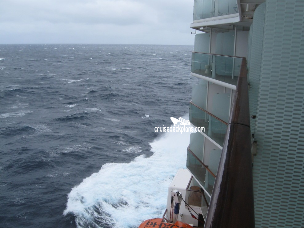 All category V3 cabins have obstructed view when looking down to the water and slightly obstructed horizon view. Category DV and V2 has unobstructed horizon view but obstructed views when looking down to the water (except some forward V2 cabins)