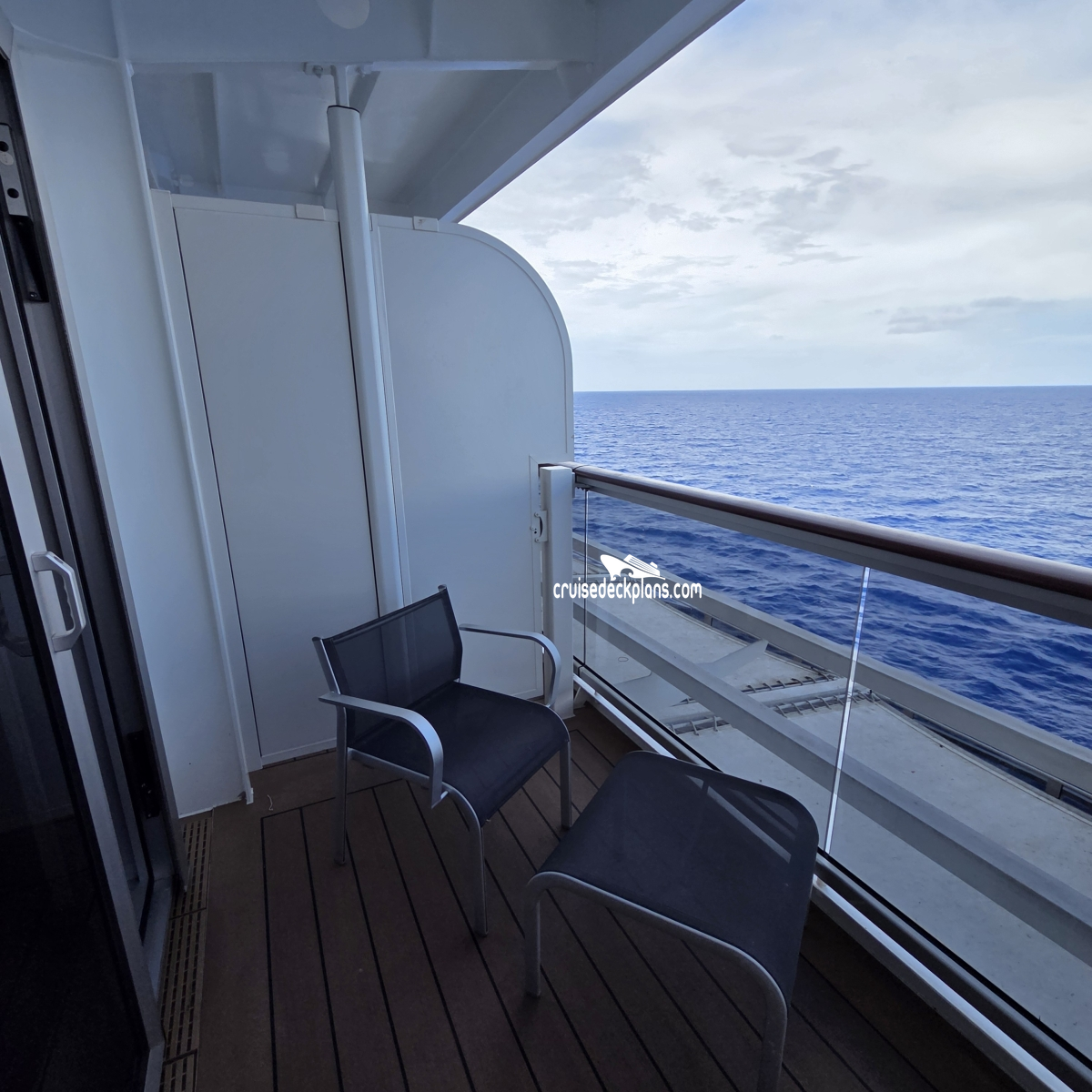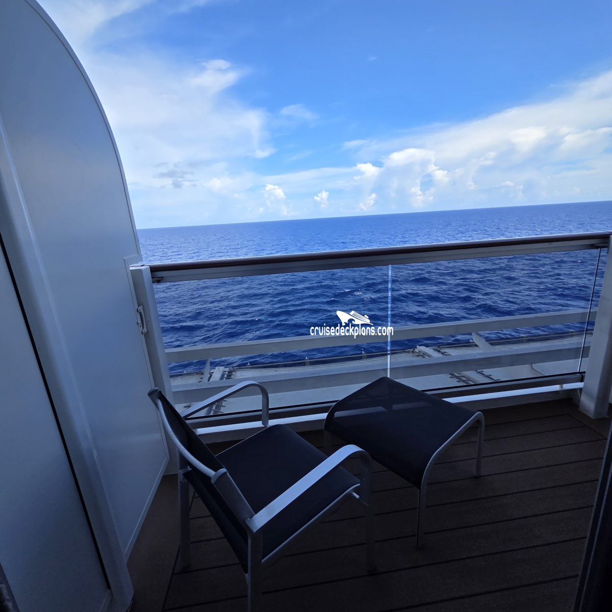Deck 9 category B3 cabins on port and starboard side will have balcony partitions that do not extend all the way to the railing. This means that the area around the railing will have clear dividers (railing height) between balconies. You will be able to see your neighbors balcony.