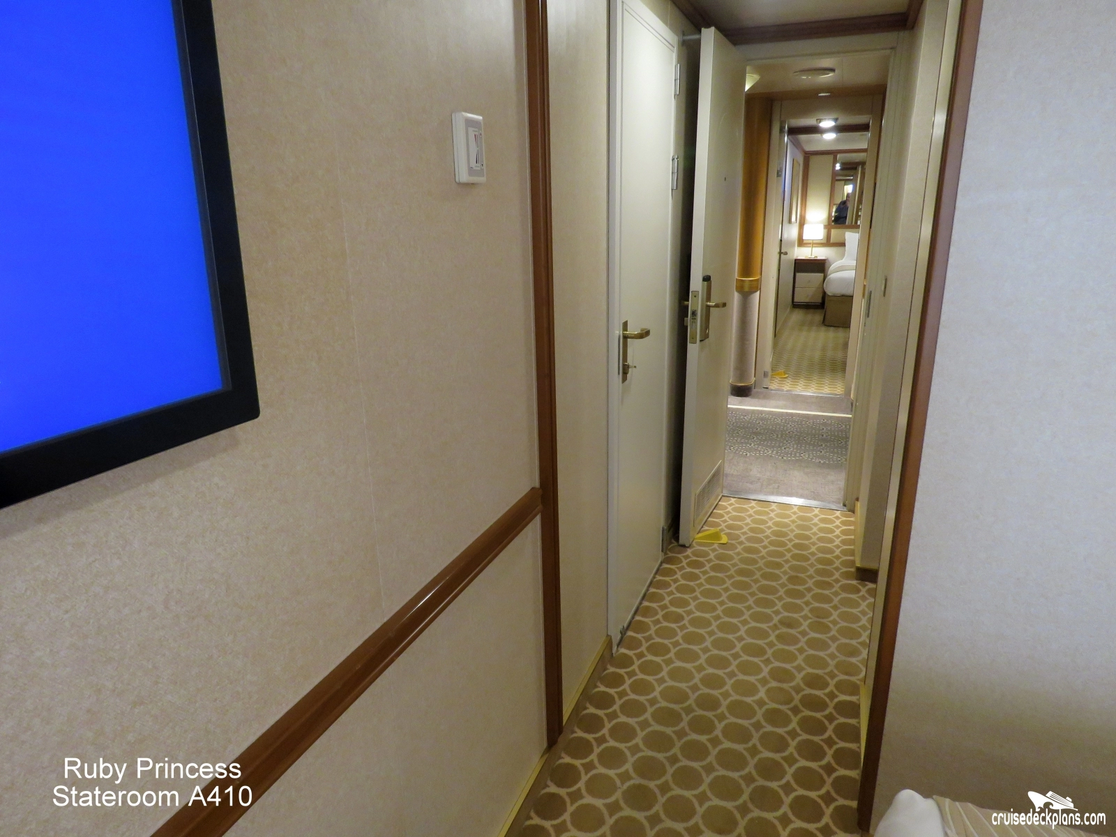 These are some actual stateroom pictures of cabin A410 on the Ruby Princess. Click on images below for larger image and slide show. The slide show will show the date the picture was uploaded to out website. This date is useful because Ruby Princess typically will update its cabins every three to five years with new carpeting and decor. We will keep older pictures for you to compare the more recent photos to. The pictures are sorted by the newest ones first. Most of our cabin pictures are contributed by actual cruisers. We pay 50 cents for any that we use. You can upload your cabin photos HERE. Afer you are done looking at these photos and/or the videos below you can click here to select another cabin.