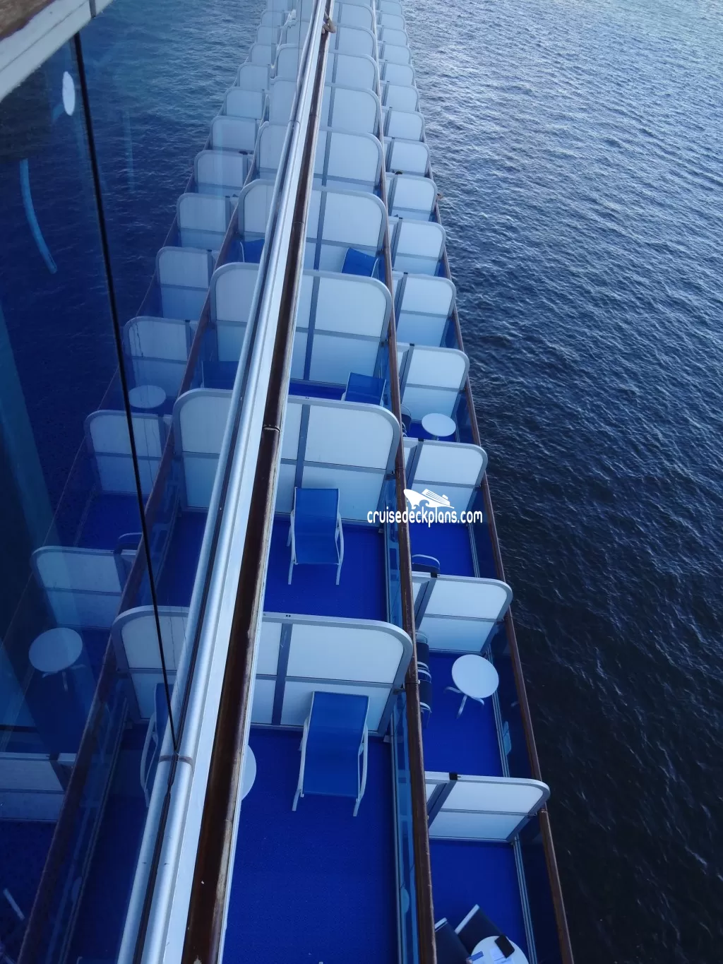 Balcony size ranges from 46 to 89 square feet. Caribe deck balconies are sized 9 ft. wide x 9 ft. deep and have ceiling overhang/balcony cover over the first 5 ft.