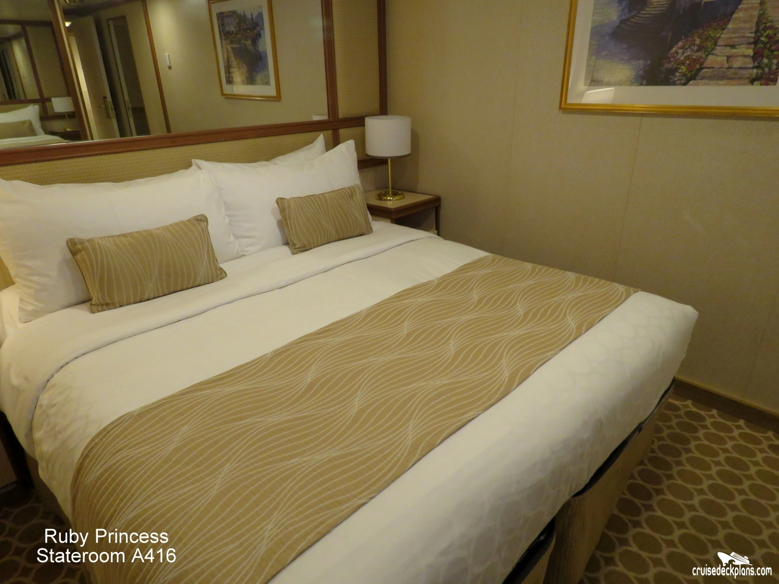 Ruby Princess Interior cabin number A416 ACTUAL videos and/or pictures, floor plans, diagrams and detailed features including a deck image of the actual location on the Ruby Princess ship for cabin A416. Cruisedeckplans.com has 73,444 different (staterooms) cabins that have actual cabin pictures and/or cabin videos taken by real cruisers. That is plenty of coverage to provide you with a good sampling of all the different cabins on cruise ships. Take a minute and notice the breadcrumb menu above. This is a quick easy way to navigate our website. You can also use the menu above for menu items specific to the Ruby Princess cruise ship.