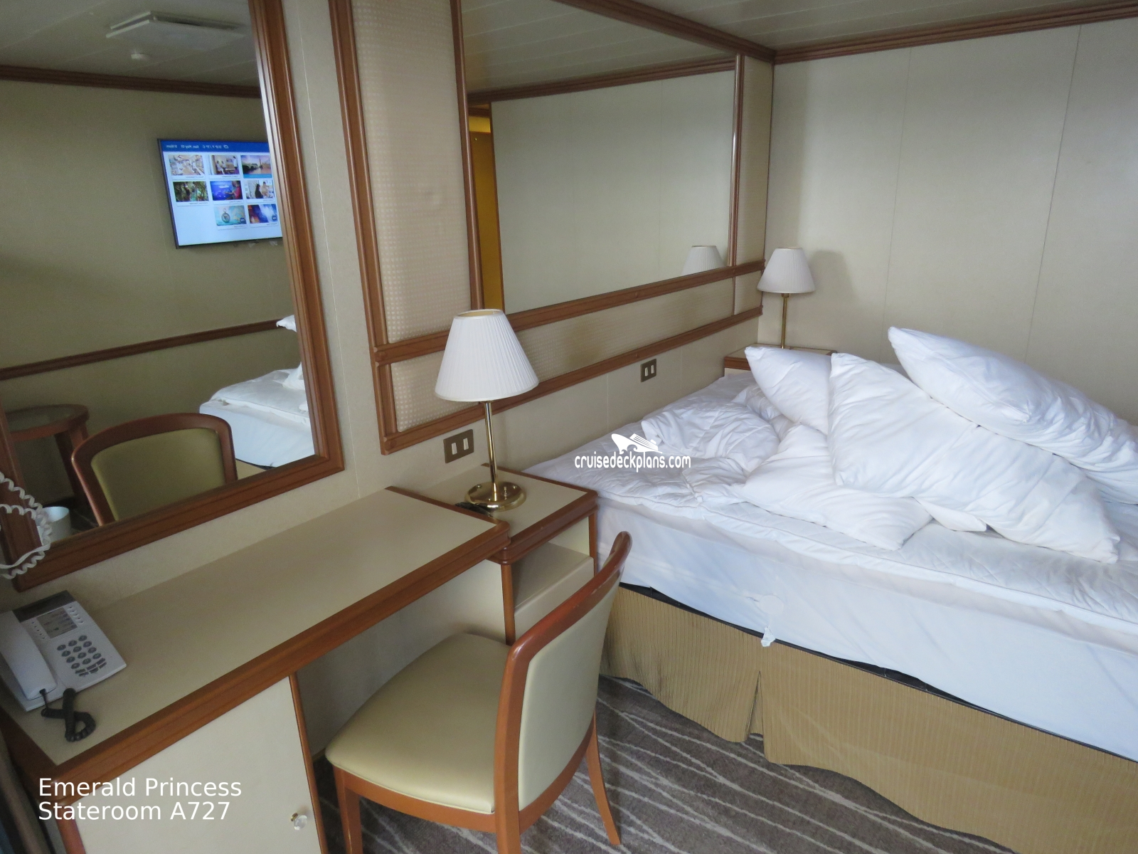 These are some actual stateroom pictures of cabin A727 on the Emerald Princess. Click on images below for larger image and slide show. The slide show will show the date the picture was uploaded to out website. This date is useful because Emerald Princess typically will update its cabins every three to five years with new carpeting and decor. We will keep older pictures for you to compare the more recent photos to. The pictures are sorted by the newest ones first. Most of our cabin pictures are contributed by actual cruisers. We pay 50 cents for any that we use. You can upload your cabin photos HERE. Afer you are done looking at these photos and/or the videos below you can click here to select another cabin.