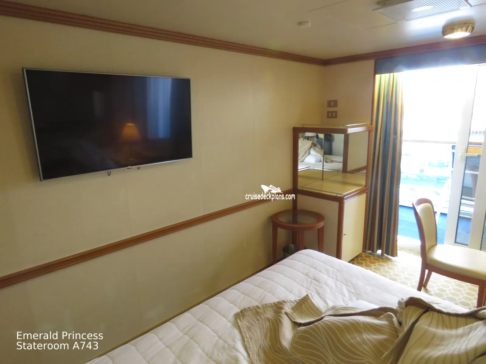 These are some actual stateroom pictures of cabin A743 on the Emerald Princess. Click on images below for larger image and slide show. The slide show will show the date the picture was uploaded to out website. This date is useful because Emerald Princess typically will update its cabins every three to five years with new carpeting and decor. We will keep older pictures for you to compare the more recent photos to. The pictures are sorted by the newest ones first. Most of our cabin pictures are contributed by actual cruisers. We pay 50 cents for any that we use. You can upload your cabin photos HERE. Afer you are done looking at these photos and/or the videos below you can click here to select another cabin.