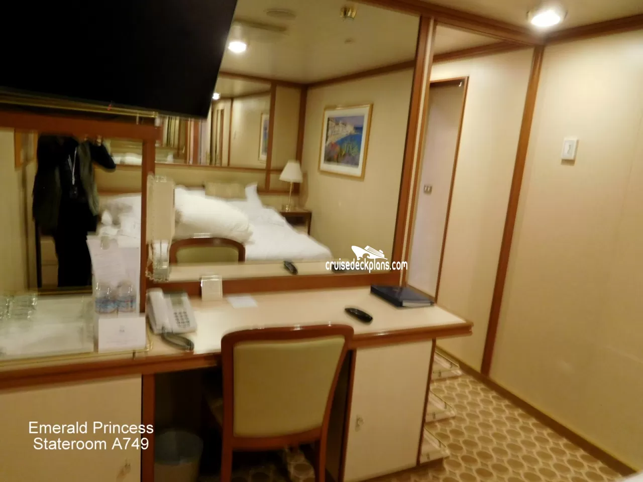 These are some actual stateroom pictures of cabin A749 on the Emerald Princess. Click on images below for larger image and slide show. The slide show will show the date the picture was uploaded to out website. This date is useful because Emerald Princess typically will update its cabins every three to five years with new carpeting and decor. We will keep older pictures for you to compare the more recent photos to. The pictures are sorted by the newest ones first. Most of our cabin pictures are contributed by actual cruisers. We pay 50 cents for any that we use. You can upload your cabin photos HERE. Afer you are done looking at these photos and/or the videos below you can click here to select another cabin.