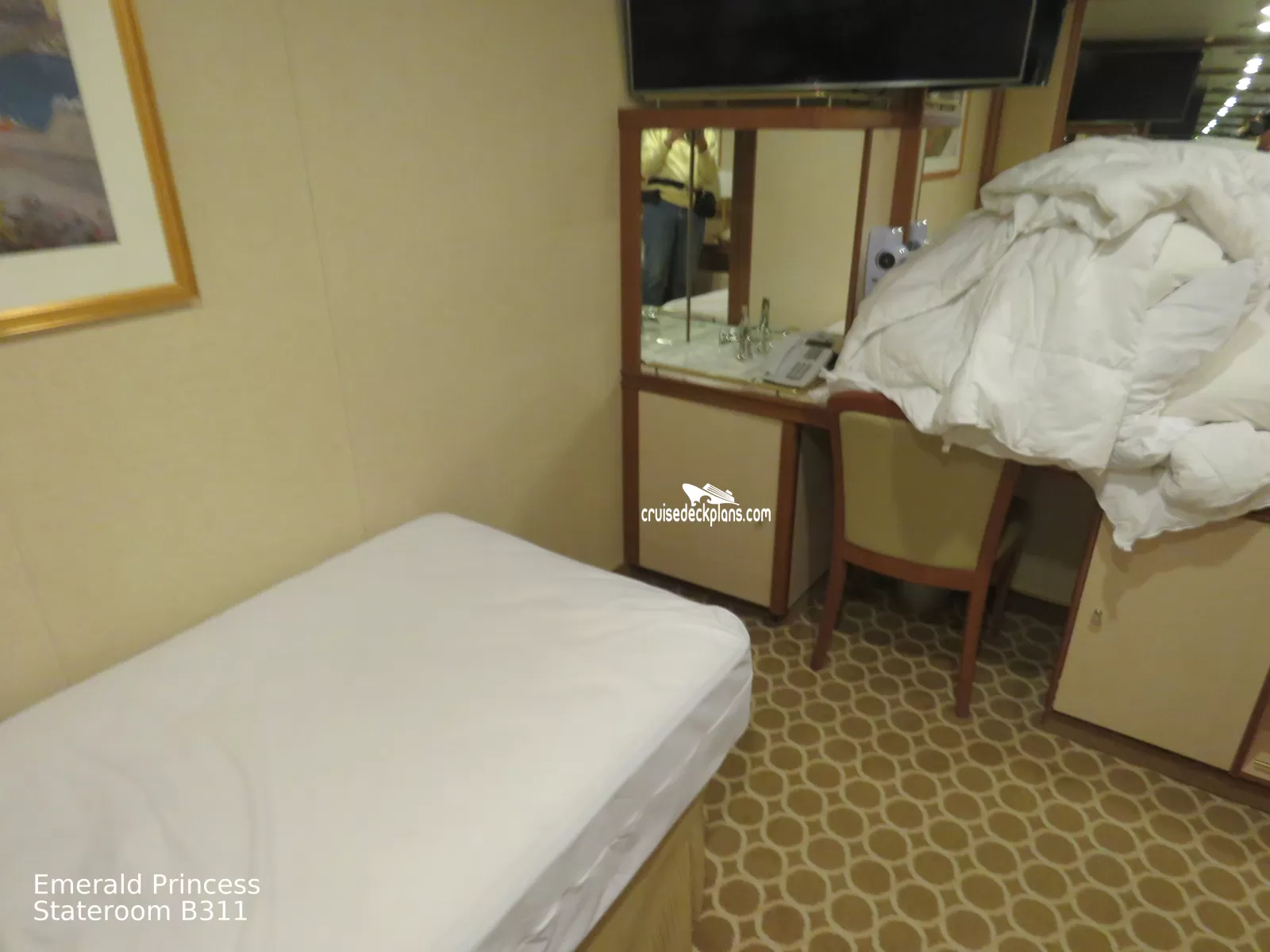 These are some actual stateroom pictures of cabin B311 on the Emerald Princess. Click on images below for larger image and slide show. The slide show will show the date the picture was uploaded to out website. This date is useful because Emerald Princess typically will update its cabins every three to five years with new carpeting and decor. We will keep older pictures for you to compare the more recent photos to. The pictures are sorted by the newest ones first. Most of our cabin pictures are contributed by actual cruisers. We pay 50 cents for any that we use. You can upload your cabin photos HERE. Afer you are done looking at these photos and/or the videos below you can click here to select another cabin.