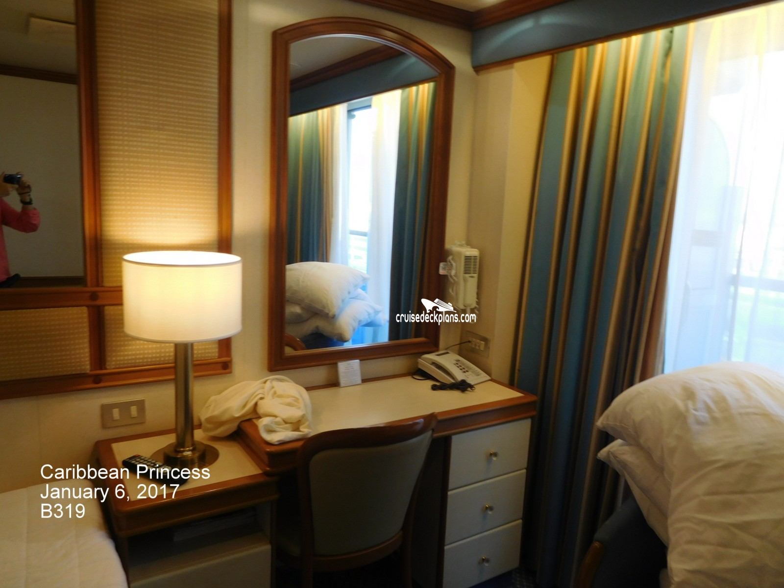These are some actual stateroom pictures of cabin B319 on the Caribbean Princess. Click on images below for larger image and slide show. The slide show will show the date the picture was uploaded to out website. This date is useful because Caribbean Princess typically will update its cabins every three to five years with new carpeting and decor. We will keep older pictures for you to compare the more recent photos to. The pictures are sorted by the newest ones first. Most of our cabin pictures are contributed by actual cruisers. We pay 50 cents for any that we use. You can upload your cabin photos HERE. Afer you are done looking at these photos and/or the videos below you can click here to select another cabin.