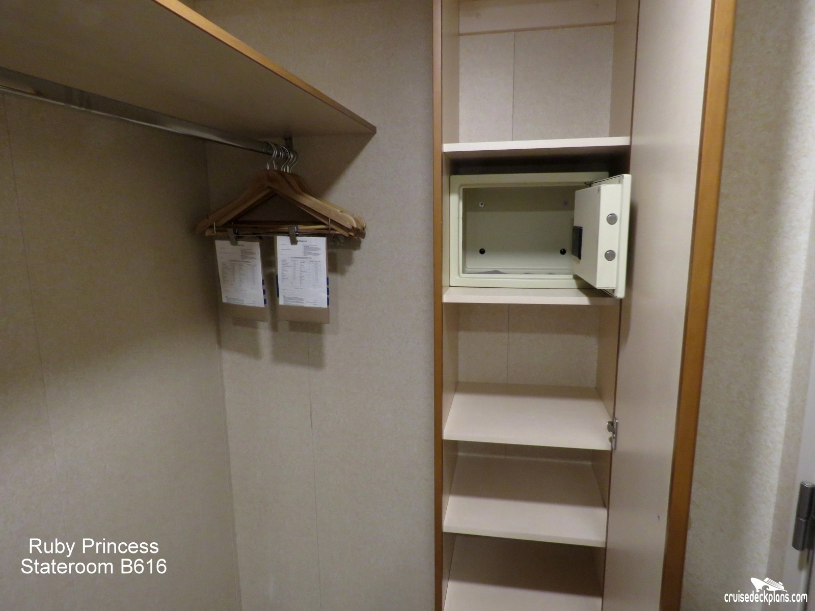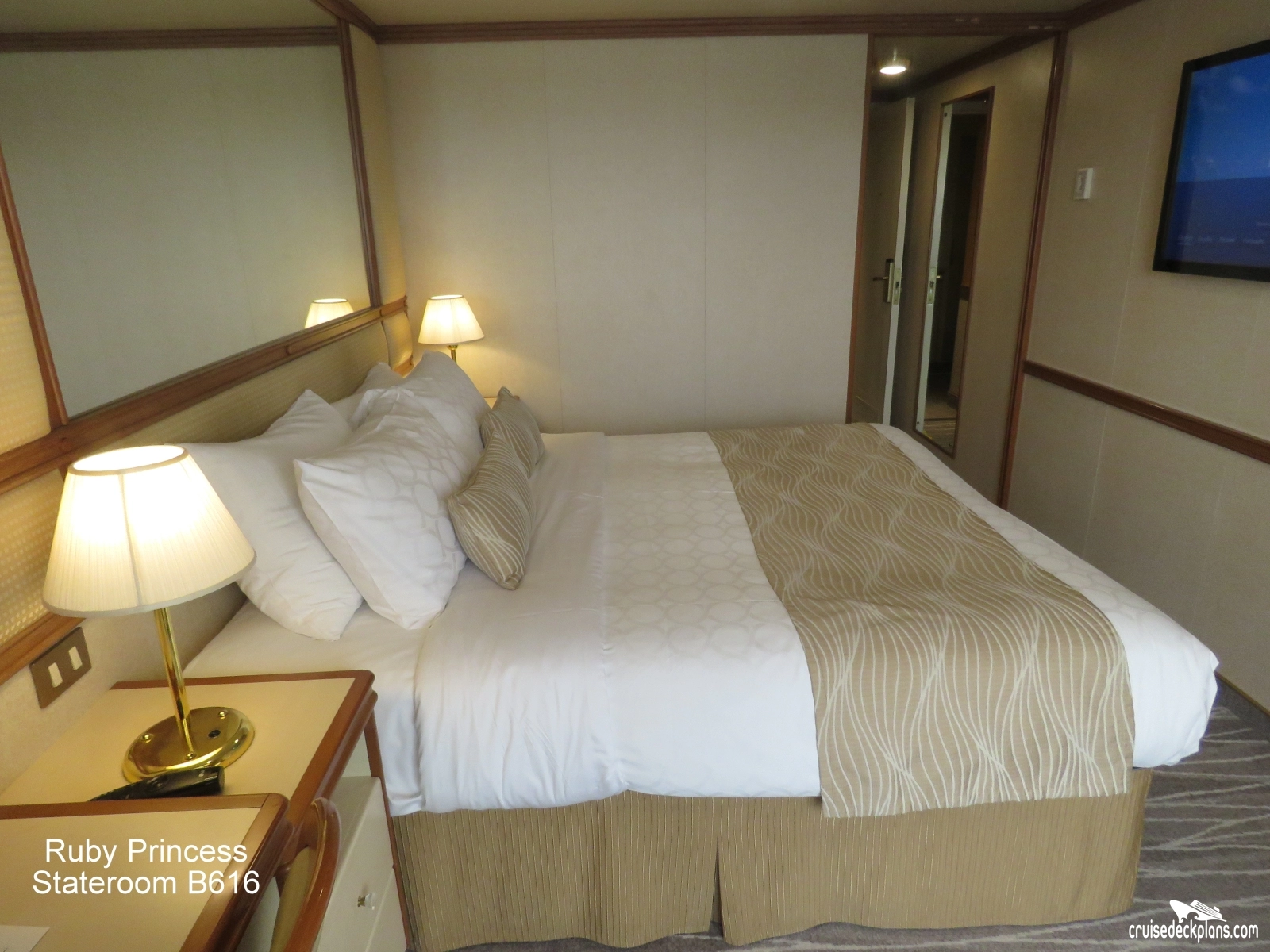 These are some actual stateroom pictures of cabin B616 on the Ruby Princess. Click on images below for larger image and slide show. The slide show will show the date the picture was uploaded to out website. This date is useful because Ruby Princess typically will update its cabins every three to five years with new carpeting and decor. We will keep older pictures for you to compare the more recent photos to. The pictures are sorted by the newest ones first. Most of our cabin pictures are contributed by actual cruisers. We pay 50 cents for any that we use. You can upload your cabin photos HERE. Afer you are done looking at these photos and/or the videos below you can click here to select another cabin.