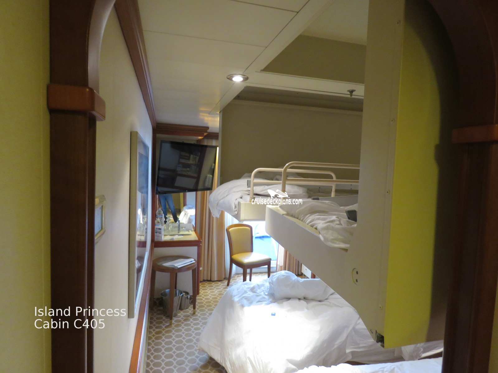 These are some actual stateroom pictures of cabin C405 on the Island Princess. Click on images below for larger image and slide show. The slide show will show the date the picture was uploaded to out website. This date is useful because Island Princess typically will update its cabins every three to five years with new carpeting and decor. We will keep older pictures for you to compare the more recent photos to. The pictures are sorted by the newest ones first. Most of our cabin pictures are contributed by actual cruisers. We pay 50 cents for any that we use. You can upload your cabin photos HERE. Afer you are done looking at these photos and/or the videos below you can click here to select another cabin.