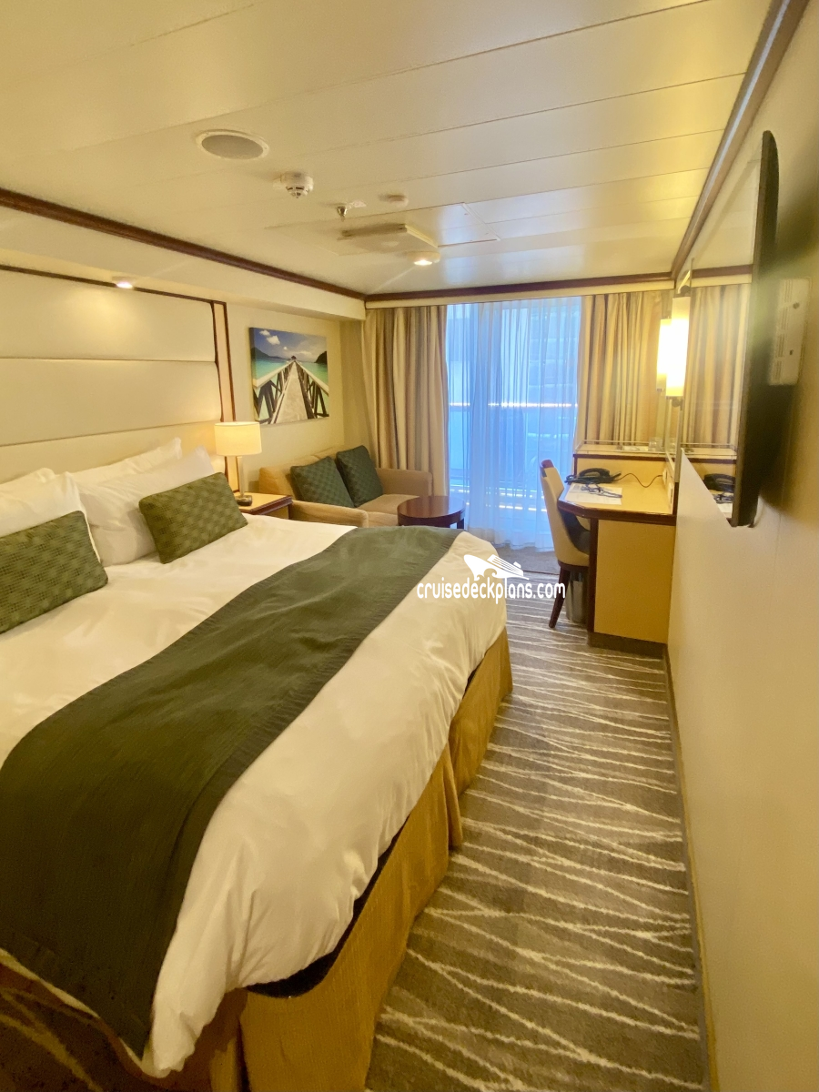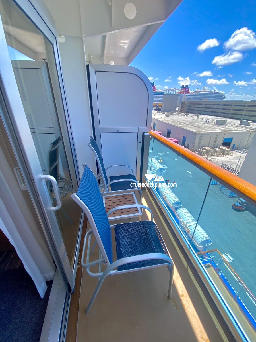 IMPORTANT NOTE: Category DV, DW, DZ have obstructed views due to solid steel railings or tops of lifeboats. Category DZ upper deck balconies can only be used while in port. When upper berth or sofa bed is used it will block balcony. Cabin sizes with balcony ranges from 233 to 291 square feet. Category DV is 253 square feet. Category DZ is 263 to 291 square feet including balcony. Category DB, DC, DD, DE, DF, DW are 233 square feet. Category DA is 249 square feet.