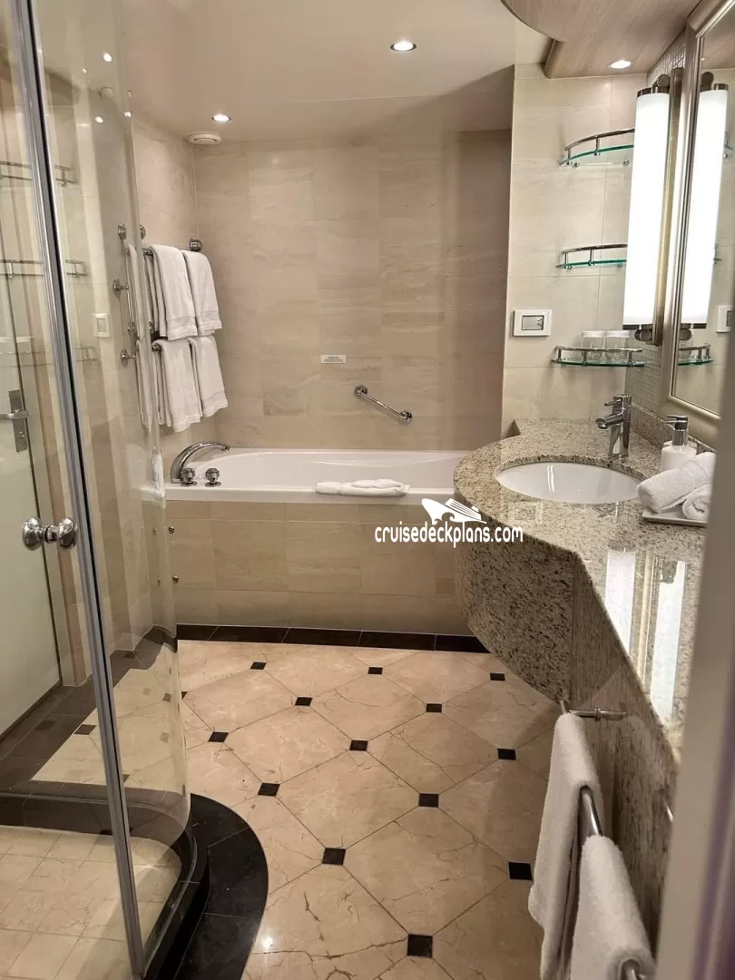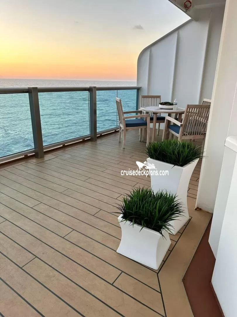 Category S3 Owner Suite cabin is 470 square feet plus the following balcony sizes: Marina, Riviera, Dolphin decks 210 square feet. Aloha and Caribe deck 120 square feet. Baja deck 190 square feet.