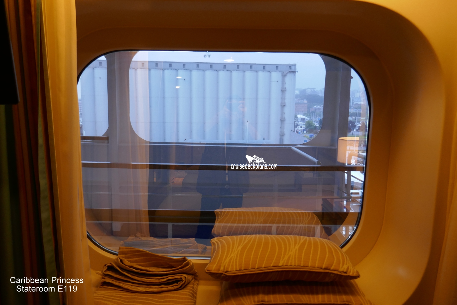 Caribbean Princess Oceanview cabin number E119 ACTUAL videos and/or pictures, floor plans, diagrams and detailed features including a deck image of the actual location on the Caribbean Princess ship for cabin E119. Cruisedeckplans.com has 73,088 different (staterooms) cabins that have actual cabin pictures and/or cabin videos taken by real cruisers. That is plenty of coverage to provide you with a good sampling of all the different cabins on cruise ships. Take a minute and notice the breadcrumb menu above. This is a quick easy way to navigate our website. You can also use the menu above for menu items specific to the Caribbean Princess cruise ship.