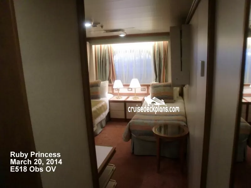 Ruby Princess Oceanview cabin number E518 ACTUAL videos and/or pictures, floor plans, diagrams and detailed features including a deck image of the actual location on the Ruby Princess ship for cabin E518. Cruisedeckplans.com has 73,462 different (staterooms) cabins that have actual cabin pictures and/or cabin videos taken by real cruisers. That is plenty of coverage to provide you with a good sampling of all the different cabins on cruise ships. Take a minute and notice the breadcrumb menu above. This is a quick easy way to navigate our website. You can also use the menu above for menu items specific to the Ruby Princess cruise ship.