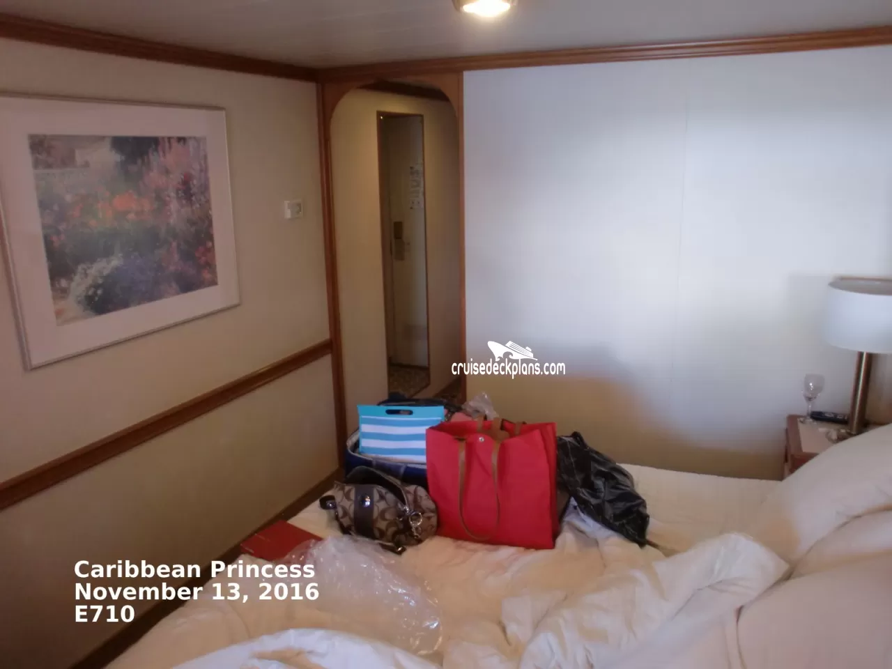These are some actual stateroom pictures of cabin E710 on the Caribbean Princess. Click on images below for larger image and slide show. The slide show will show the date the picture was uploaded to out website. This date is useful because Caribbean Princess typically will update its cabins every three to five years with new carpeting and decor. We will keep older pictures for you to compare the more recent photos to. The pictures are sorted by the newest ones first. Most of our cabin pictures are contributed by actual cruisers. We pay 50 cents for any that we use. You can upload your cabin photos HERE. Afer you are done looking at these photos and/or the videos below you can click here to select another cabin.
