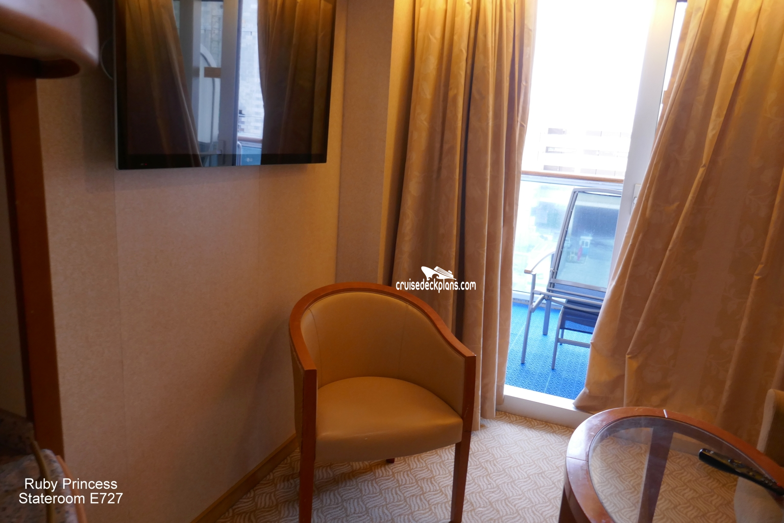 Ruby Princess Mini-Suite cabin number E727 ACTUAL videos and/or pictures, floor plans, diagrams and detailed features including a deck image of the actual location on the Ruby Princess ship for cabin E727. Cruisedeckplans.com has 75,122 different (staterooms) cabins that have actual cabin pictures and/or cabin videos taken by real cruisers. That is plenty of coverage to provide you with a good sampling of all the different cabins on cruise ships. Take a minute and notice the breadcrumb menu above. This is a quick easy way to navigate our website. You can also use the menu above for menu items specific to the Ruby Princess cruise ship.