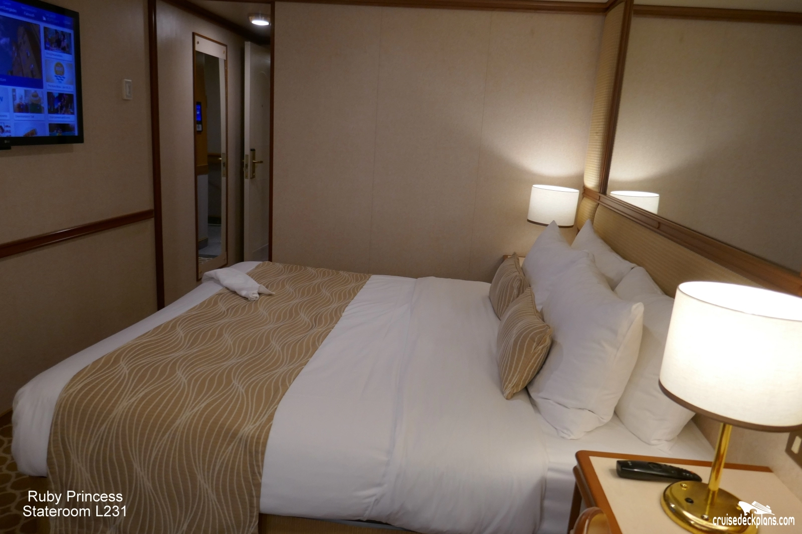These are some actual stateroom pictures of cabin L231 on the Ruby Princess. Click on images below for larger image and slide show. The slide show will show the date the picture was uploaded to out website. This date is useful because Ruby Princess typically will update its cabins every three to five years with new carpeting and decor. We will keep older pictures for you to compare the more recent photos to. The pictures are sorted by the newest ones first. Most of our cabin pictures are contributed by actual cruisers. We pay 50 cents for any that we use. You can upload your cabin photos HERE. Afer you are done looking at these photos and/or the videos below you can click here to select another cabin.