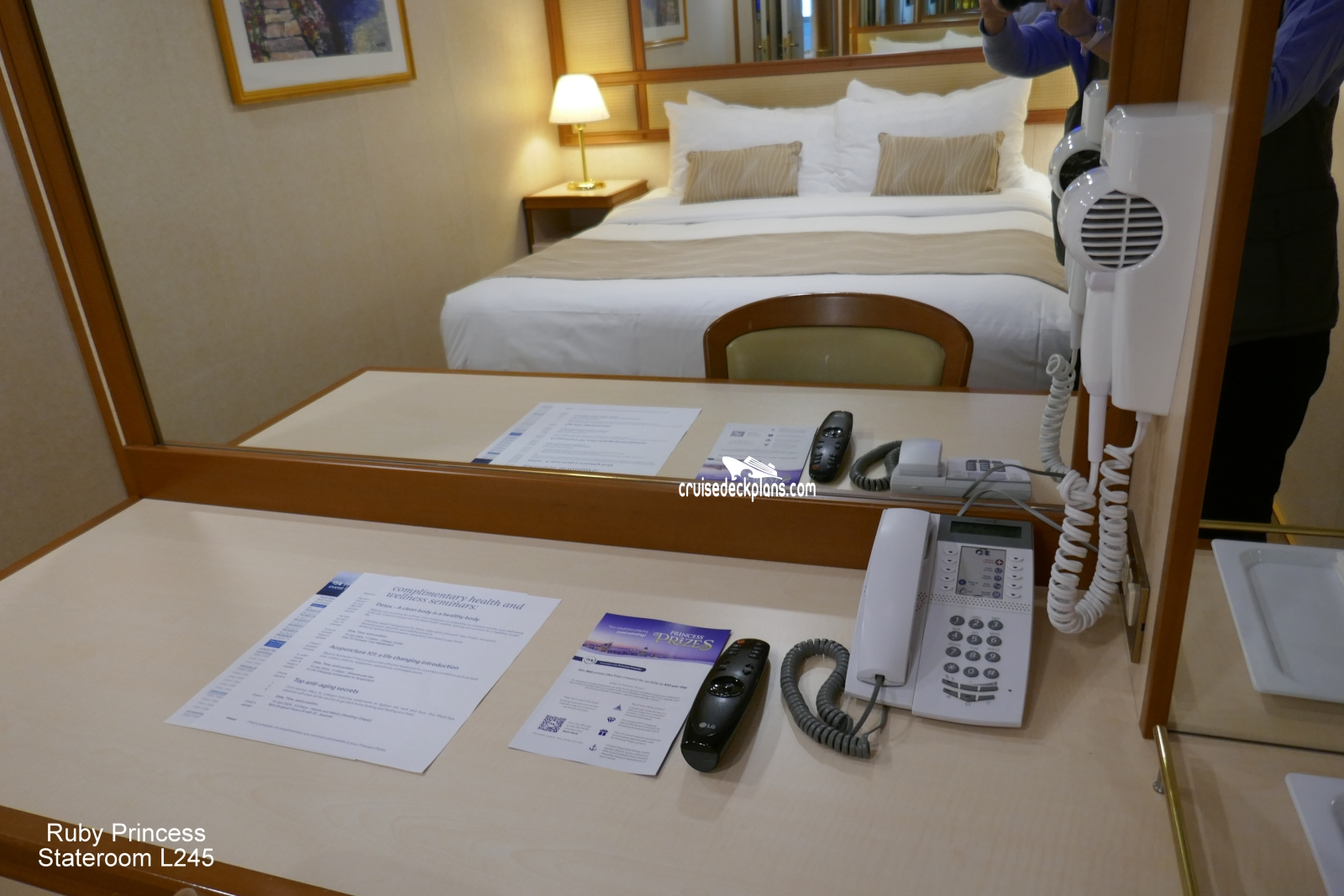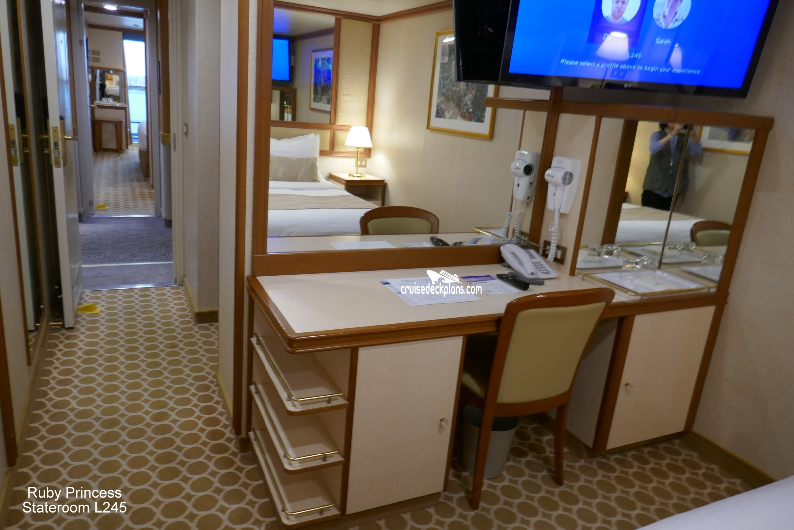 These are some actual stateroom pictures of cabin L245 on the Ruby Princess. Click on images below for larger image and slide show. The slide show will show the date the picture was uploaded to out website. This date is useful because Ruby Princess typically will update its cabins every three to five years with new carpeting and decor. We will keep older pictures for you to compare the more recent photos to. The pictures are sorted by the newest ones first. Most of our cabin pictures are contributed by actual cruisers. We pay 50 cents for any that we use. You can upload your cabin photos HERE. Afer you are done looking at these photos and/or the videos below you can click here to select another cabin.