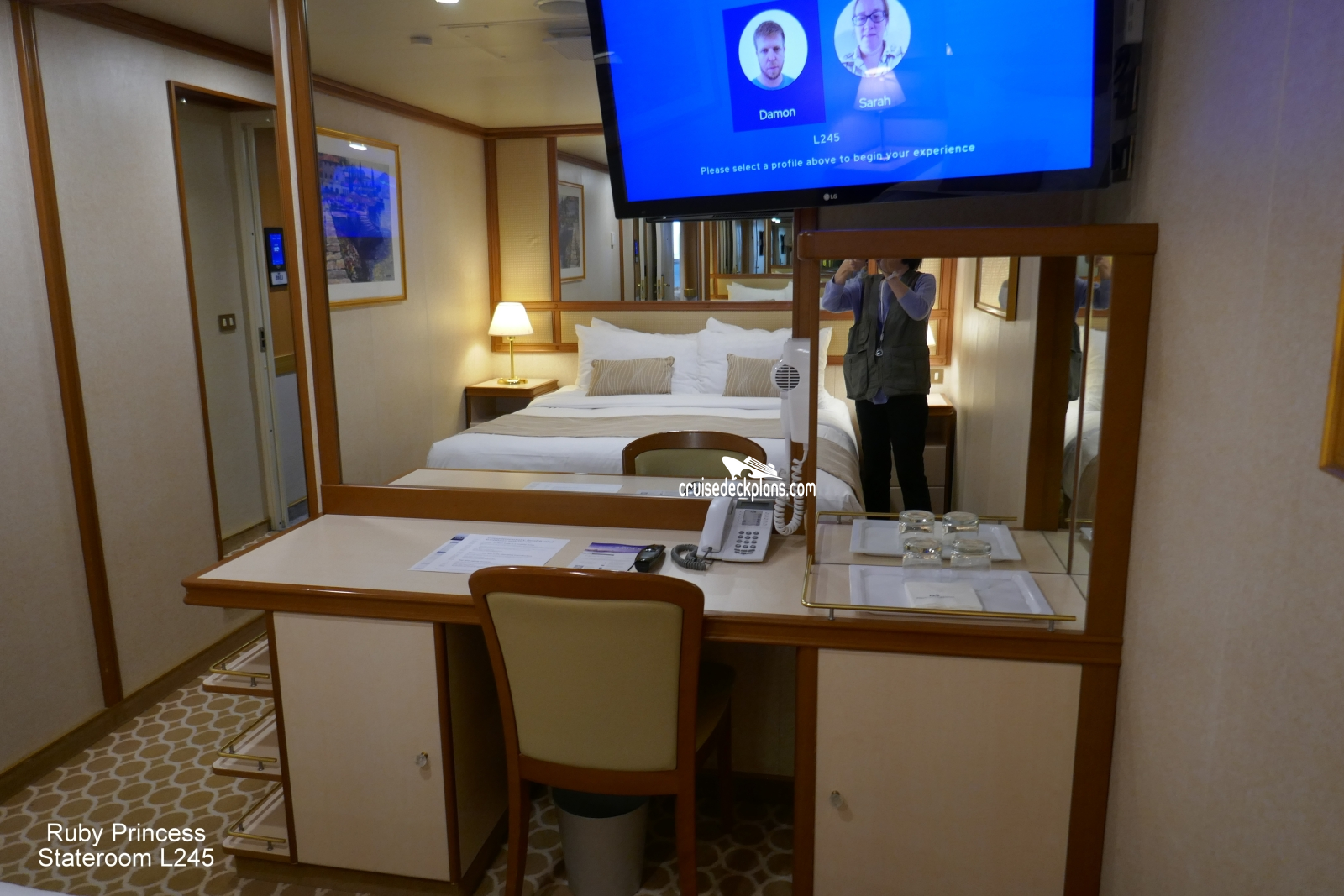 Ruby Princess Interior cabin number L245 ACTUAL videos and/or pictures, floor plans, diagrams and detailed features including a deck image of the actual location on the Ruby Princess ship for cabin L245. Cruisedeckplans.com has 73,521 different (staterooms) cabins that have actual cabin pictures and/or cabin videos taken by real cruisers. That is plenty of coverage to provide you with a good sampling of all the different cabins on cruise ships. Take a minute and notice the breadcrumb menu above. This is a quick easy way to navigate our website. You can also use the menu above for menu items specific to the Ruby Princess cruise ship.