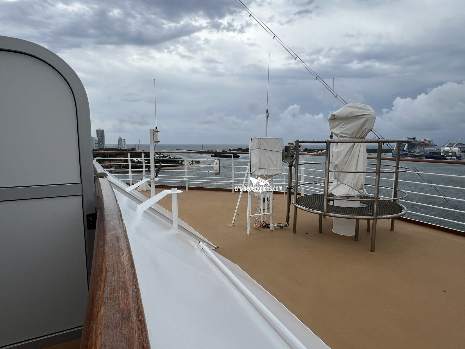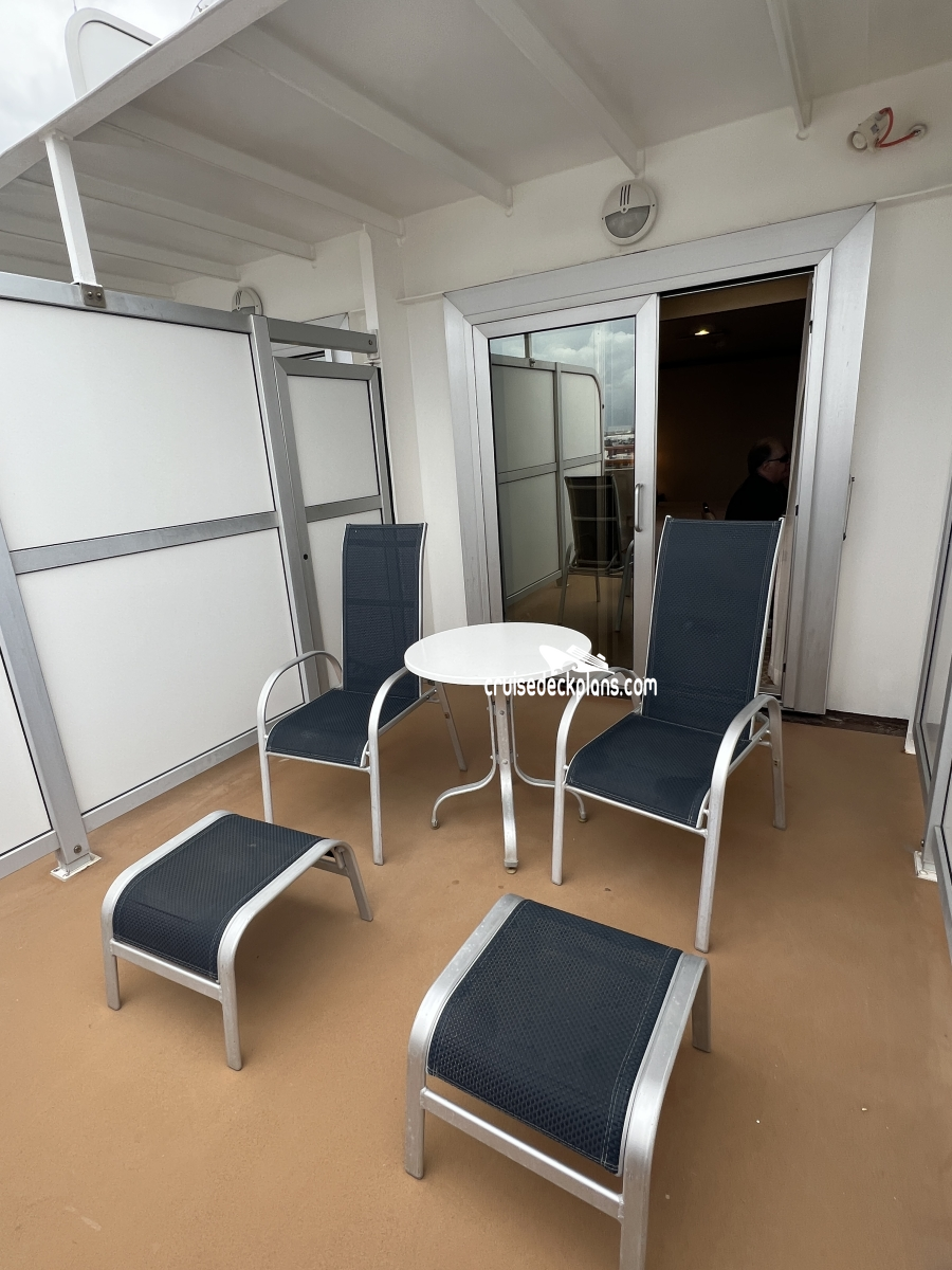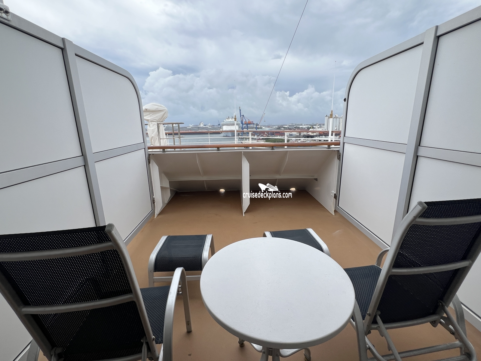 IMPORTANT NOTE: Category DV, DW, DZ have obstructed views due to solid steel railings or tops of lifeboats. Category DZ upper deck balconies can only be used while in port. When upper berth or sofa bed is used it will block balcony. Cabin sizes with balcony ranges from 233 to 291 square feet. Category DV is 253 square feet. Category DZ is 263 to 291 square feet including balcony. Category DB, DC, DD, DE, DF, DW are 233 square feet. Category DA is 249 square feet.