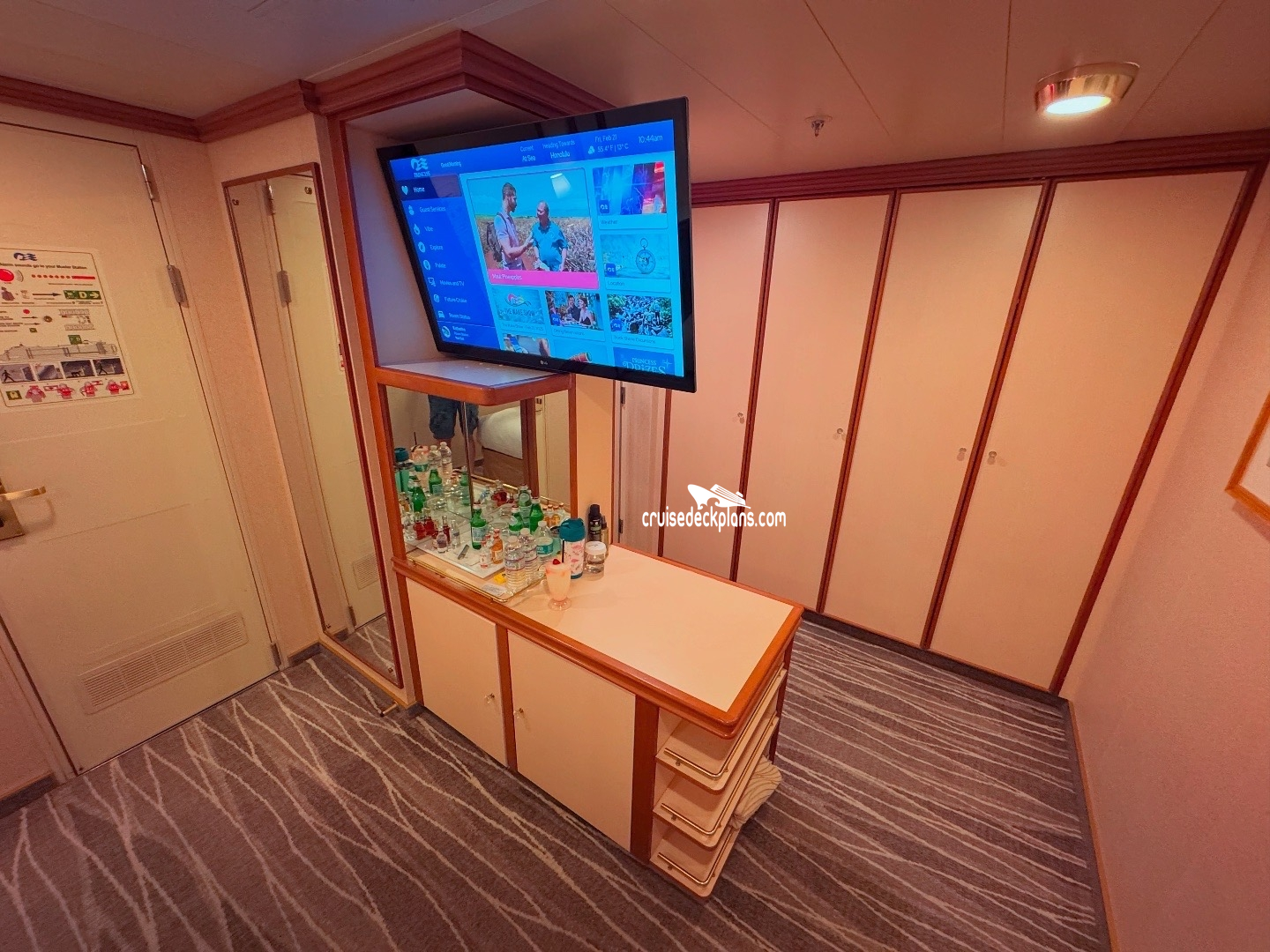 Ruby Princess Interior cabin number R403 ACTUAL videos and/or pictures, floor plans, diagrams and detailed features including a deck image of the actual location on the Ruby Princess ship for cabin R403. Cruisedeckplans.com has 73,953 different (staterooms) cabins that have actual cabin pictures and/or cabin videos taken by real cruisers. That is plenty of coverage to provide you with a good sampling of all the different cabins on cruise ships. Take a minute and notice the breadcrumb menu above. This is a quick easy way to navigate our website. You can also use the menu above for menu items specific to the Ruby Princess cruise ship.