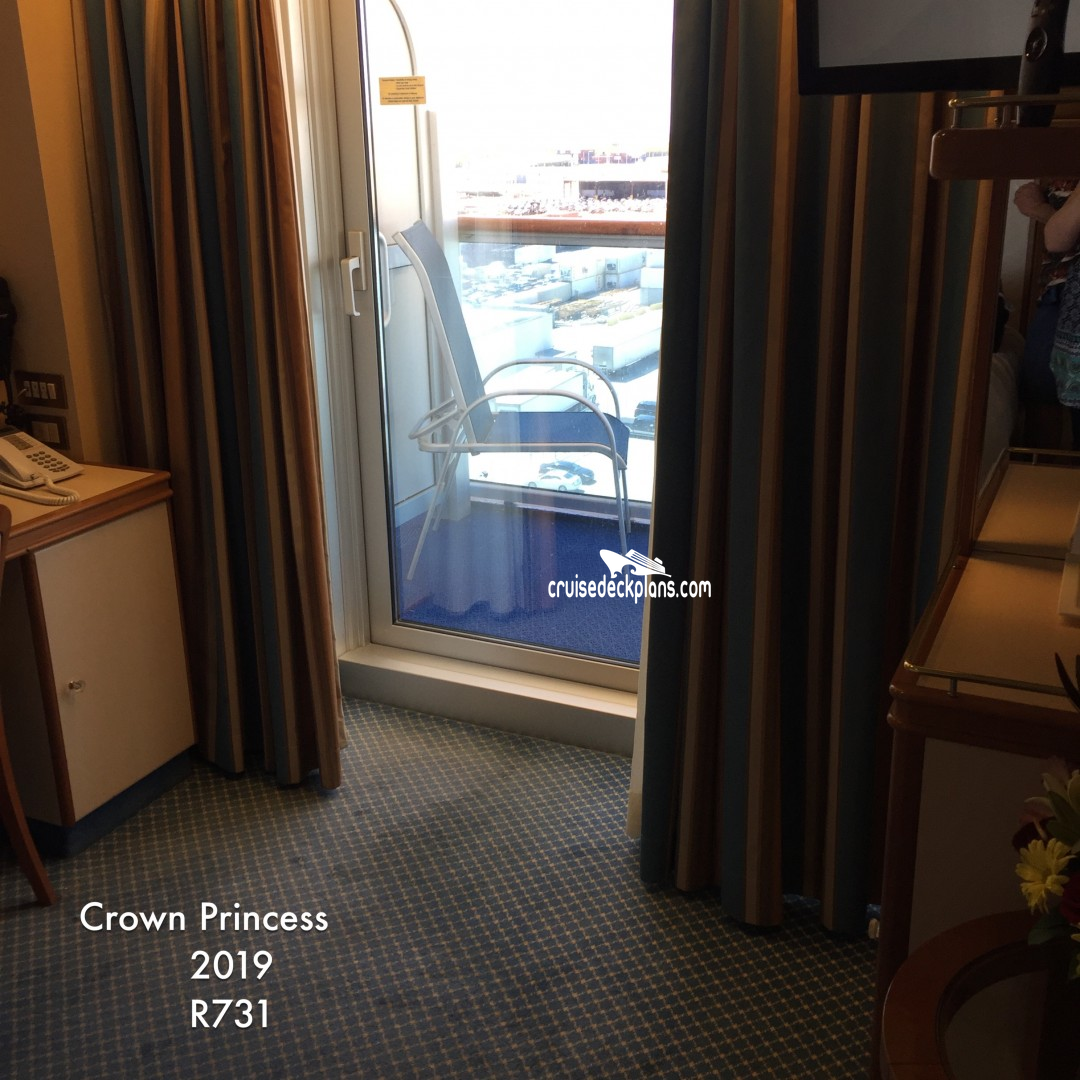 Crown Princess Balcony cabin number R731 ACTUAL videos and/or pictures, floor plans, diagrams and detailed features including a deck image of the actual location on the Crown Princess ship for cabin R731. Cruisedeckplans.com has 74,709 different (staterooms) cabins that have actual cabin pictures and/or cabin videos taken by real cruisers. That is plenty of coverage to provide you with a good sampling of all the different cabins on cruise ships. Take a minute and notice the breadcrumb menu above. This is a quick easy way to navigate our website. You can also use the menu above for menu items specific to the Crown Princess cruise ship.
