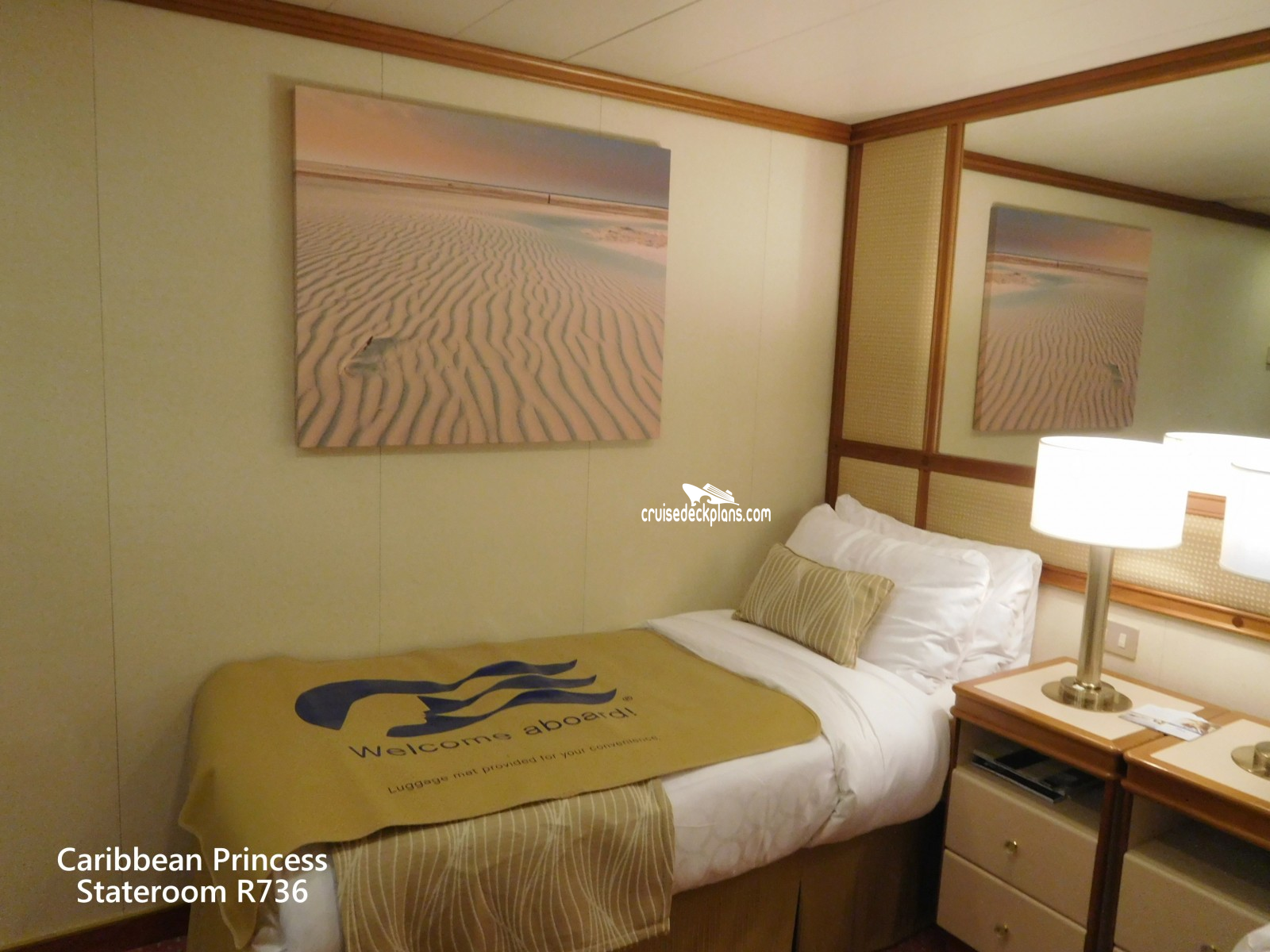 Caribbean Princess Interior cabin number R736 ACTUAL videos and/or pictures, floor plans, diagrams and detailed features including a deck image of the actual location on the Caribbean Princess ship for cabin R736. Cruisedeckplans.com has 73,153 different (staterooms) cabins that have actual cabin pictures and/or cabin videos taken by real cruisers. That is plenty of coverage to provide you with a good sampling of all the different cabins on cruise ships. Take a minute and notice the breadcrumb menu above. This is a quick easy way to navigate our website. You can also use the menu above for menu items specific to the Caribbean Princess cruise ship.