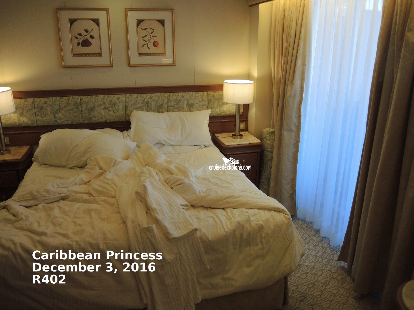 These are some actual stateroom pictures of cabin R402 on the Caribbean Princess. Click on images below for larger image and slide show. The slide show will show the date the picture was uploaded to out website. This date is useful because Caribbean Princess typically will update its cabins every three to five years with new carpeting and decor. We will keep older pictures for you to compare the more recent photos to. The pictures are sorted by the newest ones first. Most of our cabin pictures are contributed by actual cruisers. We pay 50 cents for any that we use. You can upload your cabin photos HERE. Afer you are done looking at these photos and/or the videos below you can click here to select another cabin.
