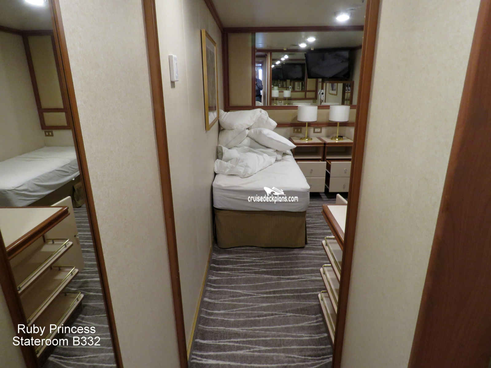 Ruby Princess Interior cabin number B332 ACTUAL videos and/or pictures, floor plans, diagrams and detailed features including a deck image of the actual location on the Ruby Princess ship for cabin B332. Cruisedeckplans.com has 65,411 different (staterooms) cabins that have actual cabin pictures and/or cabin videos taken by real cruisers. That is plenty of coverage to provide you with a good sampling of all the different cabins on cruise ships. Take a minute and notice the breadcrumb menu above. This is a quick easy way to navigate our website. You can also use the menu above for menu items specific to the Ruby Princess cruise ship.