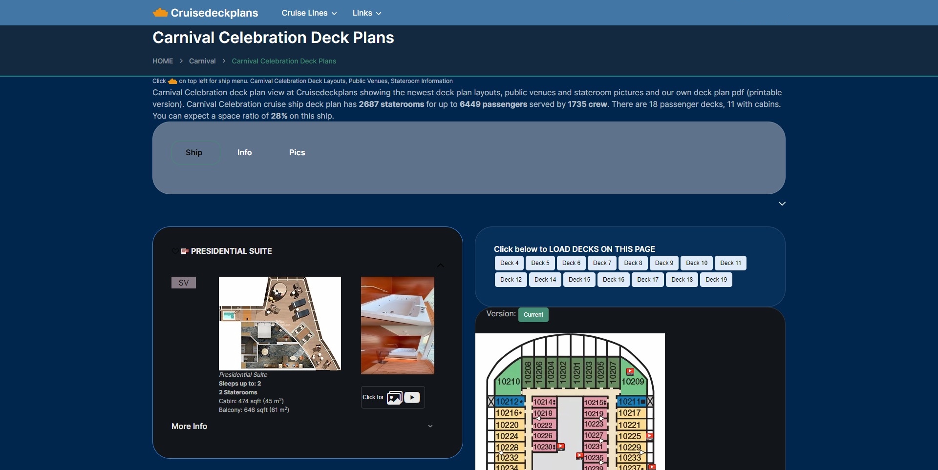 We have 602,810 cruise pictures and 47,141 stateroom videos. Printable cruise deck plans. Use our cabin check tool to see what is above or below your stateroom. Choose a link below to get started.