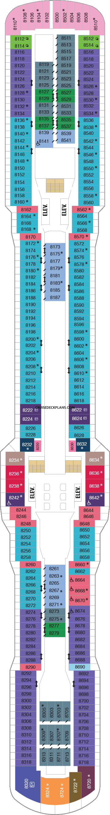 Click deck pictures to go to individual cruise deck plan pages where you can see all the public areas, venues and stateroom cabins categories for each deck.