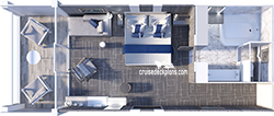 Size shown is for Category S1. Category S2 is 319 square feet plus 79 square foot balcony. Category S3 is 298 square feet plus 102 square foot balcony. Some Sky Suites can combine with nearby Sunset Veranda to create Sky Family Suite (Category SF)Stateroom Cabin Perks
