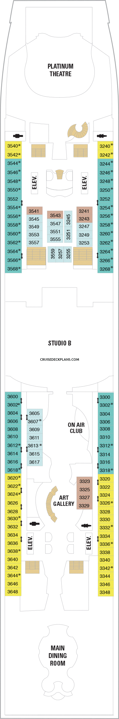 Click deck pictures to go to individual cruise deck plan pages where you can see all the public areas, venues and stateroom cabins categories for each deck.