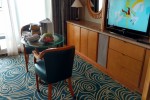 Concierge Service / Priority Check In / Priority Luggage Delivery / Priority Debarkation / Priority Tender Boarding / Reserved Show Seats / Dining in the Stateroom / Exclusive Lounge / Exclusive Full Breakfast Restaurant / Exclusive Lunch Restaurant / Thick Cotton Robes / Pillow Menu / VIP pool deck seating / Private breakfast and lunch seating in specialty restaurants on Voyager and Freedom Class ships / Mattel board games available to order for in-room entertainment for the kids / Complimentary pressing service on formal night. /Bathrooms in standard staterooms are approximately 3' x 5'8". Shampoo, conditioner and soap are supplied in suites. Shampoo and soap are supplied in standard staterooms. Showers are European telephone style, adjustable from 1.4 m to 1.9 m, or 6'2", max. clearance height. Someone taller than 6'2" will fit in the shower, but will likely have to duck to get his or her head under the running water. Shower stools and nonslip mats are provided upon request.