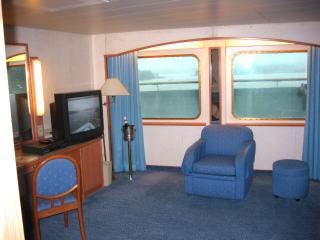 Cat. AB: Living room with convertible double-bed sofa, TV, separate bedroom with two lower beds, picture window, refrigerator, stereo with CD player, and a private bathroom with tub and shower. Concierge available.