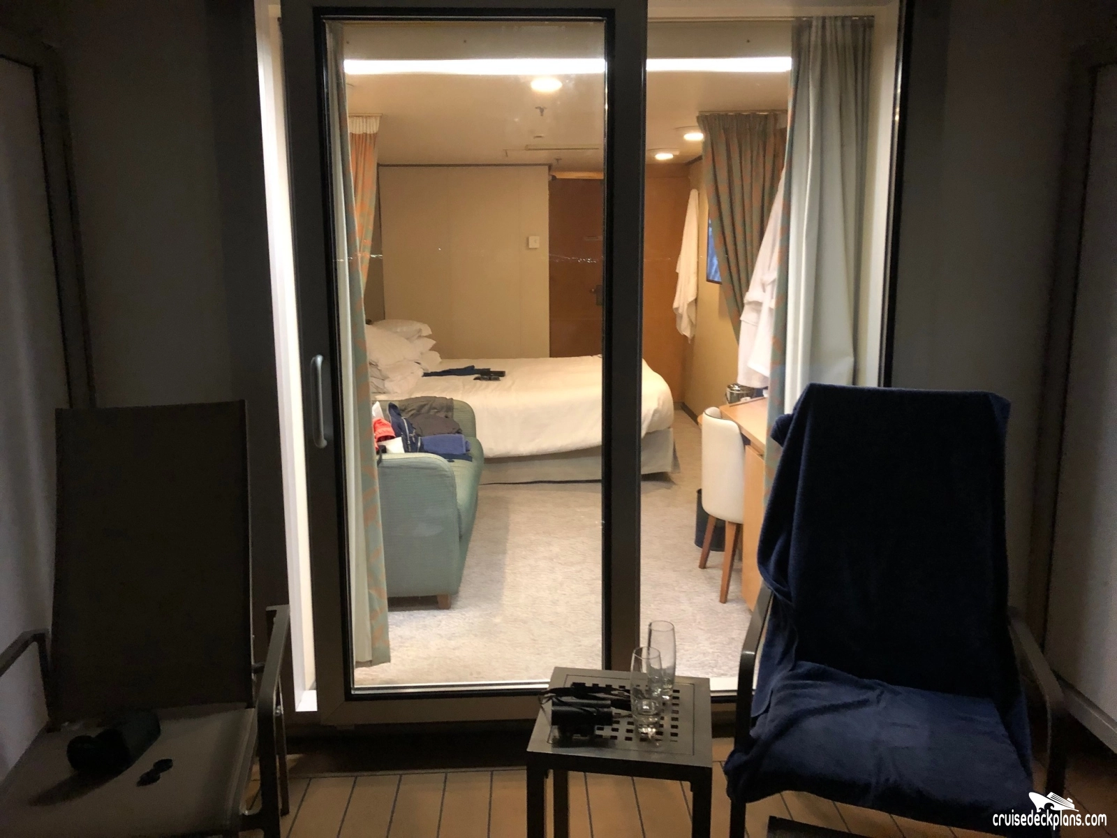 - Floor to ceiling sliding glass doors that lead to balcony with tables and chairs and steamers