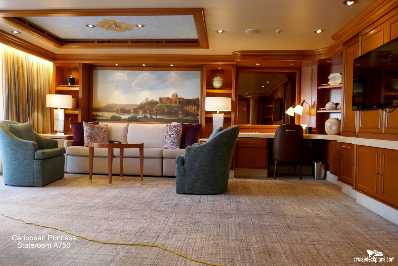 Built in 2004, the Princess Cruises Caribbean Princess internal volume is 113K tons and has 1569 staterooms for up to 3766 passengers served by 1200 crew. There are 17 passenger decks, 9 with cabins. You can expect a space ratio of 30 gross tons per passenger on this ship. On this page are the current deck plans for Caribbean Princess showing deck plan layouts, public venues and all the types of cabins including pictures and videos.