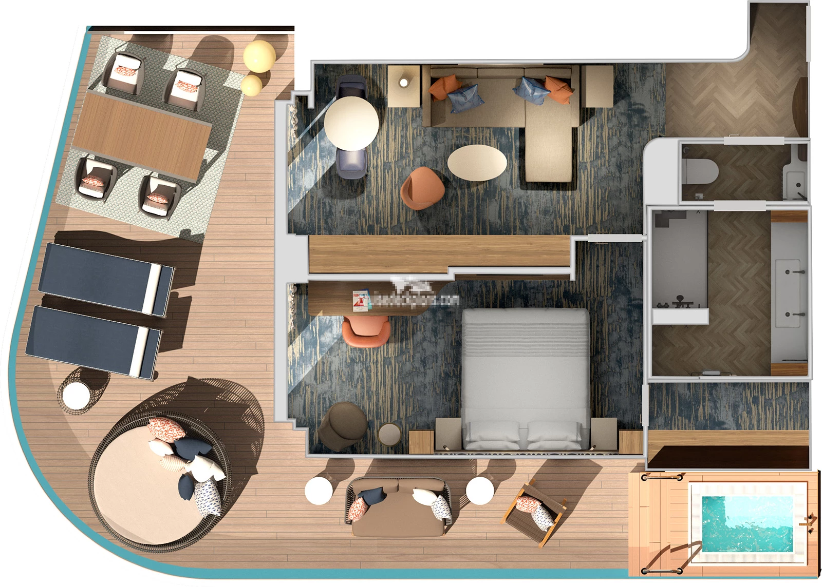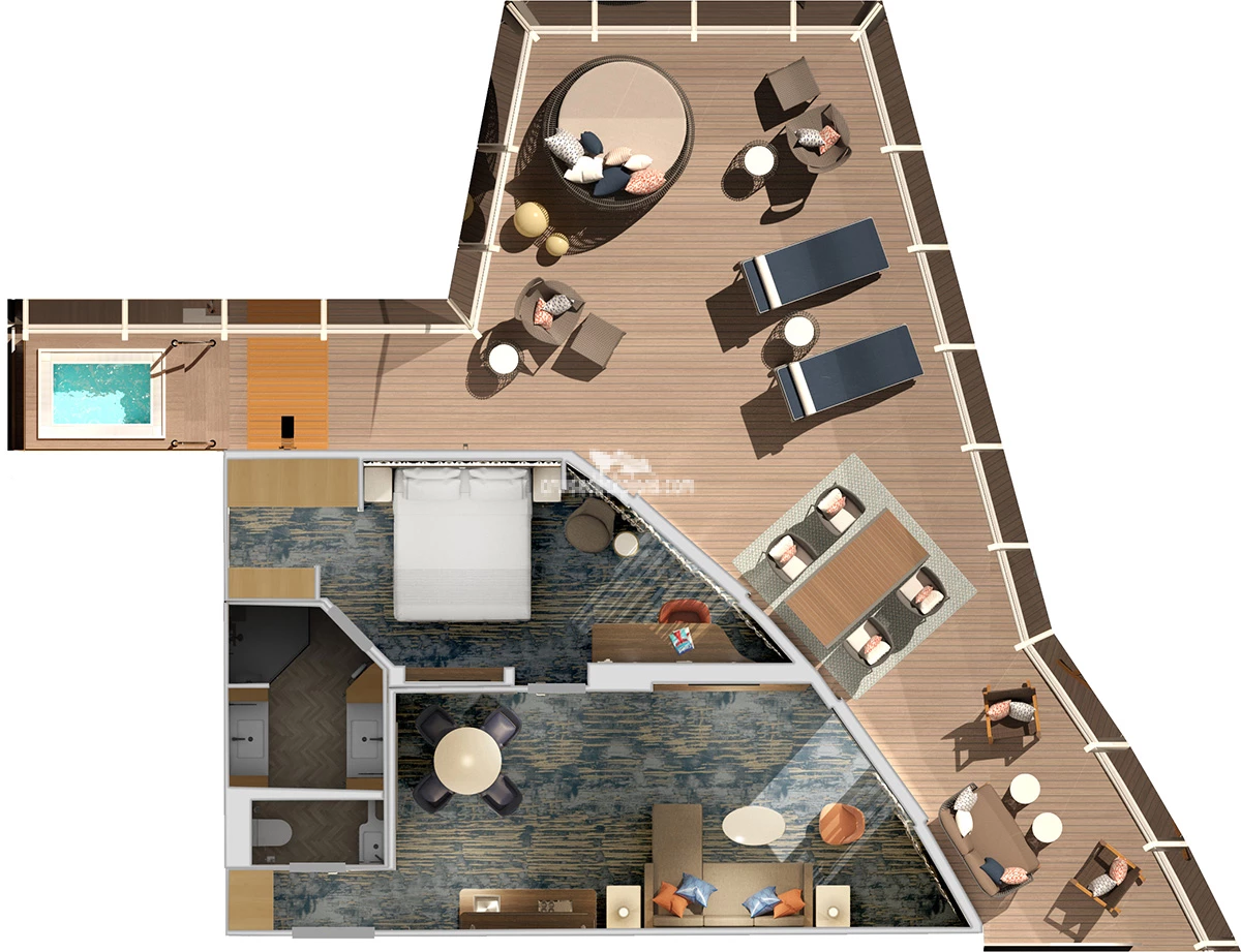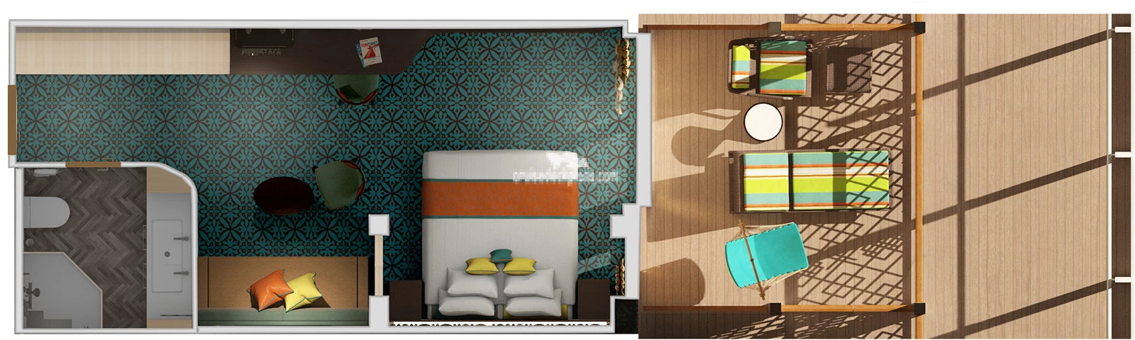 - Havana Cabana Suites (HS) feature patio chairs, hammock chair, table (the patio is elevated 4 steps down to the outer deck).
