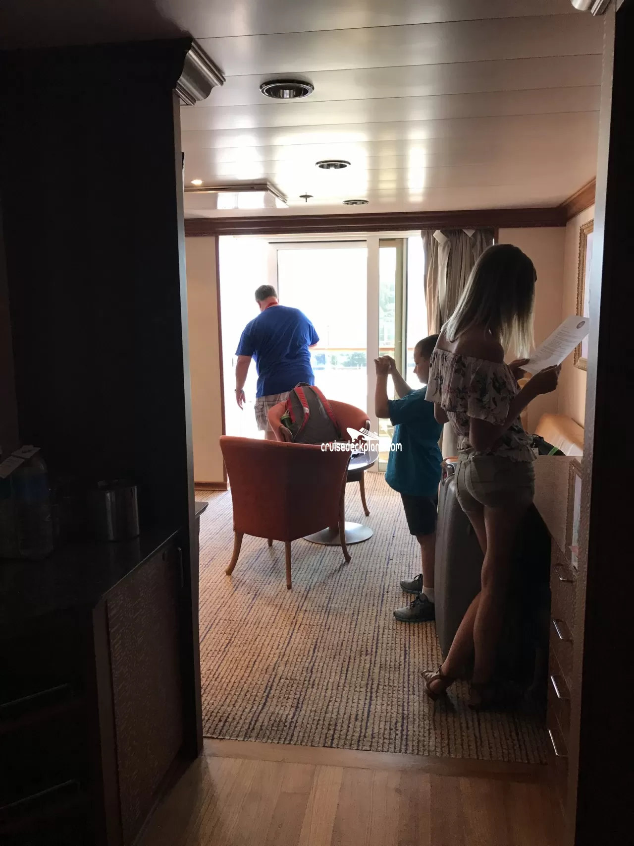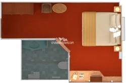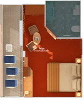 This cabin features a wrap around balcony. Staterooms 4228, 4237, 6260, 6329, 7298, 7347 ,8268 and 8273 feature a separate bedroom from sitting area with another LCD television and walk-in dressing area with vanity table and chair.Stateroom Cabin Perks