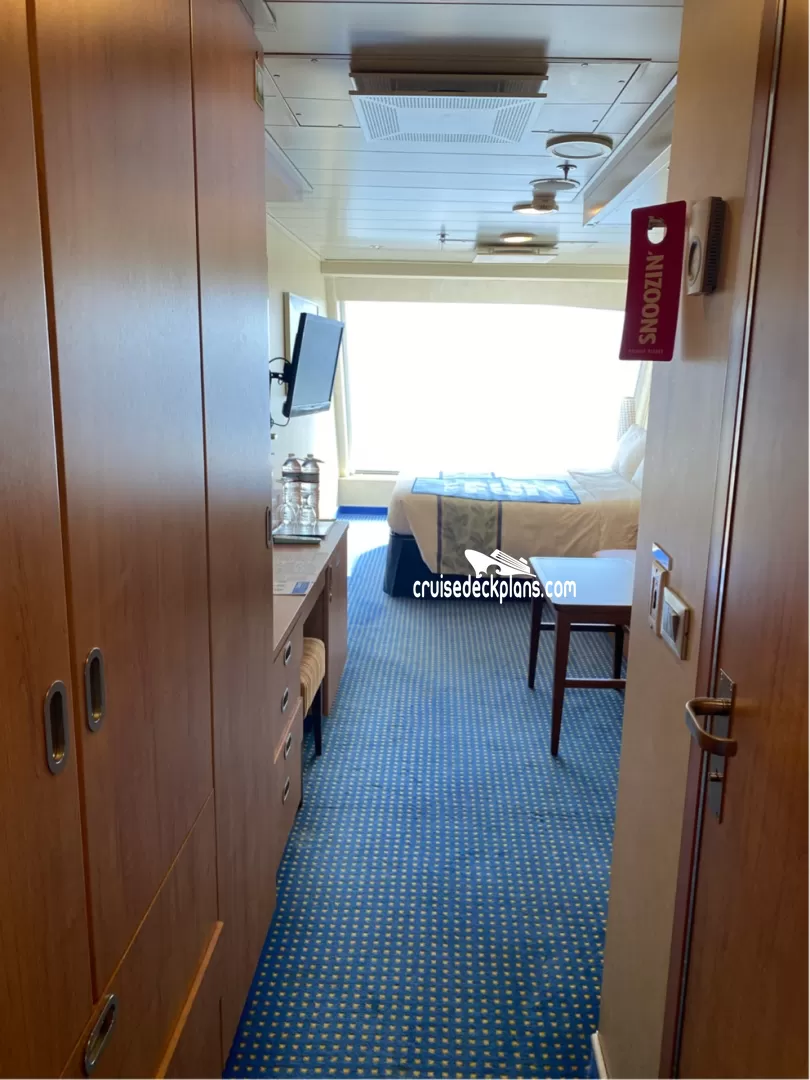 Window looks out onto outside walkway.Stateroom Cabin Perks
