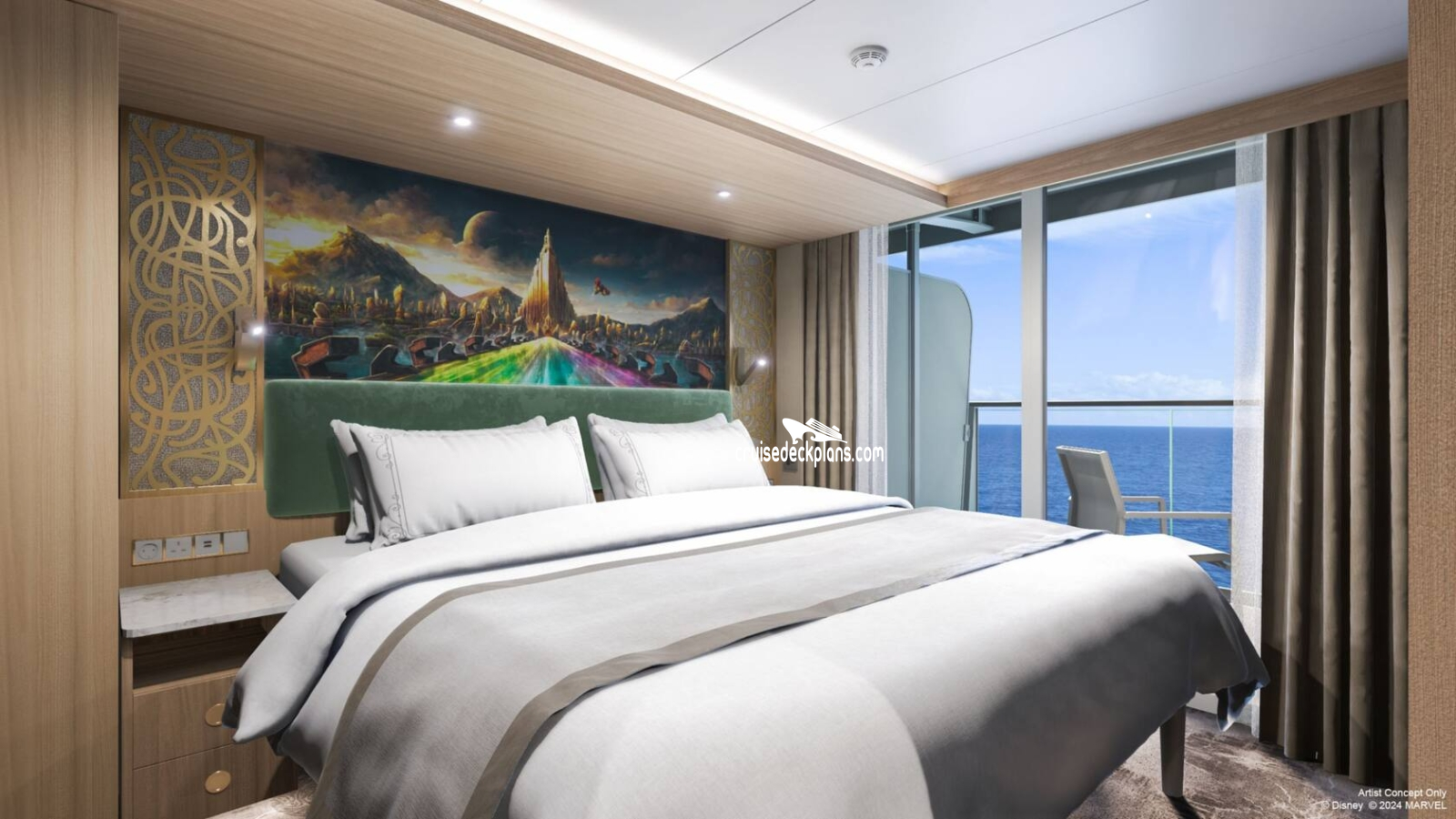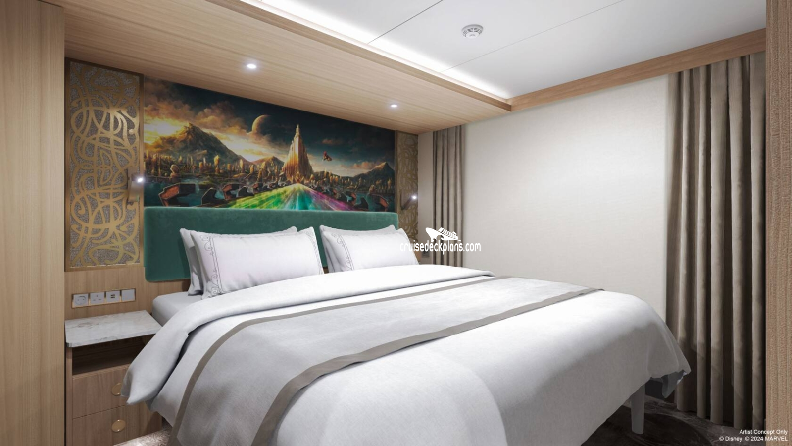 Sealy Posturepedic Euro-top mattress / Frette 100% Egyptian cotton linens / LCD flat screen tv / Ipod docking station / H20 Plus spa products /3A and 3B are Moana-themed. Category 4C: 16106, 16206 feature a queen bed instead of a king (Thor- or Aladdin-themed)