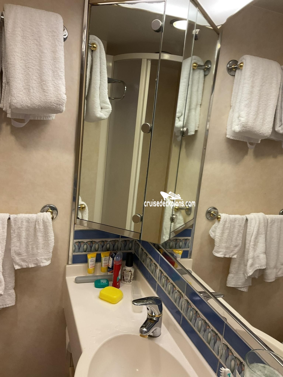 Bathrooms in standard staterooms are approximately 3' x 5'8". Shampoo, conditioner and soap are supplied in suites. Shampoo and soap are supplied in standard staterooms. Showers are European telephone style, adjustable from 1.4 m to 1.9 m, or 6'2", max. clearance height. Someone taller than 6'2" will fit in the shower, but will likely have to duck to get his or her head under the running water. Shower stools and nonslip mats are provided upon request.