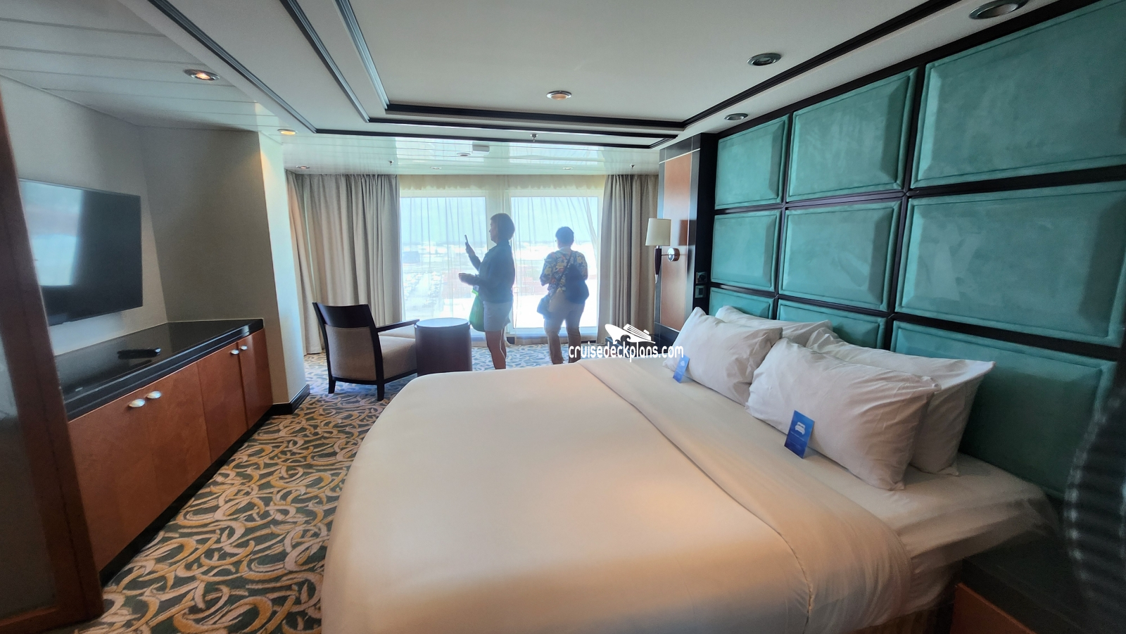Concierge Service / Priority Check In / Priority Luggage Delivery / Priority Debarkation / Priority Tender Boarding / Reserved Show Seats / Dining in the Stateroom / Exclusive Lounge / Exclusive Full Breakfast Restaurant / Thick Cotton Robes / Pillow Menu / Complimentary 24-hour room service / Personal key to the Concierge Club / Suite Cocktail Party / Complimentary pre-dinner cheese plate on first formal evening / Complimentary petits four plate on the second formal or final evening of cruise / Welcome amenities include a fruit plate and bottle of Chandon, still water, and sparkling water. /Panoramic window measures 76 inches high by 321 inches wide.