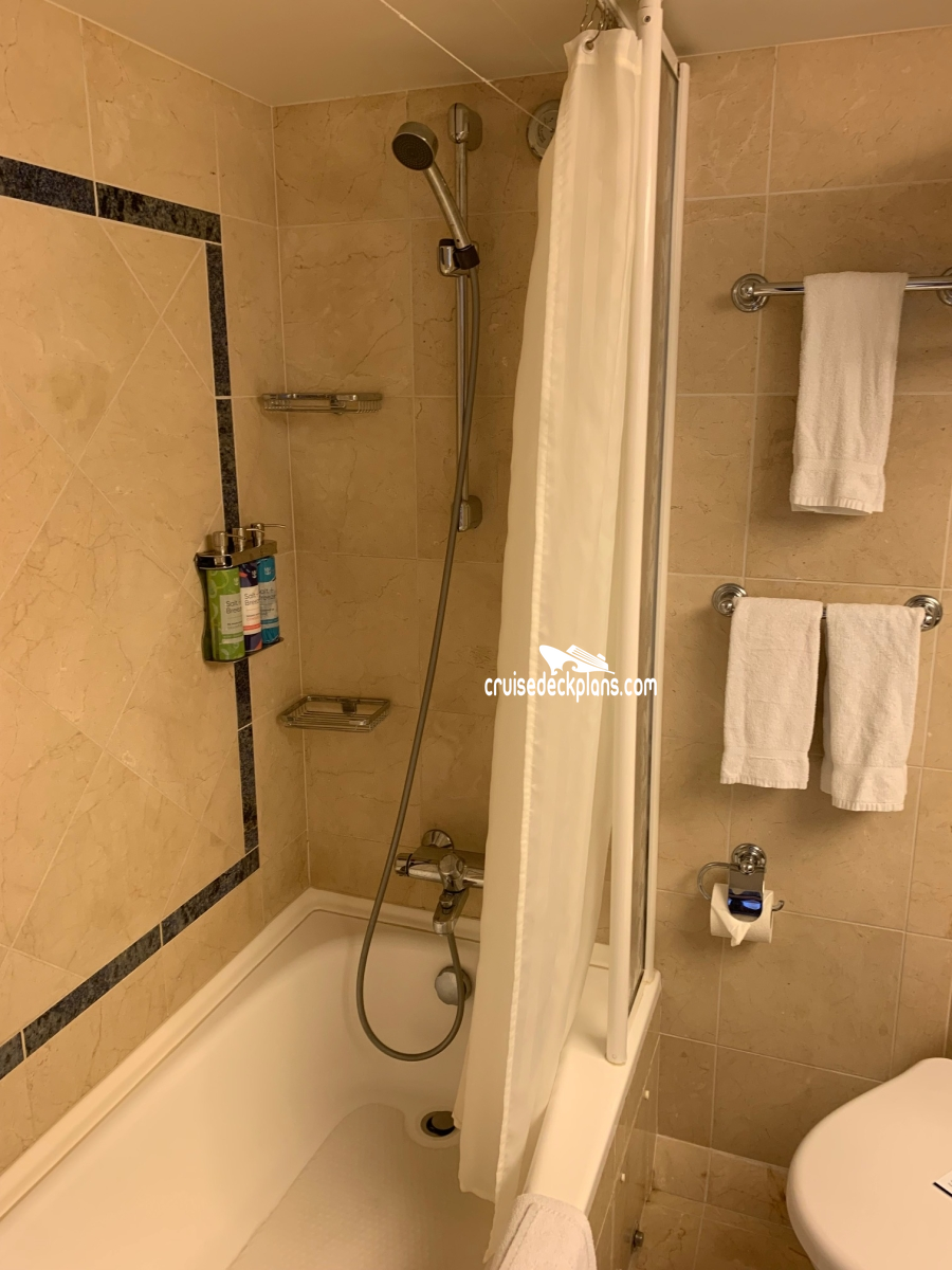 Concierge Service / Priority Check In / Priority Luggage Delivery / Priority Debarkation / Priority Tender Boarding / Reserved Show Seats / Dining in the Stateroom / Exclusive Lounge / Exclusive Full Breakfast Restaurant / Thick Cotton Robes / Pillow Menu / Complimentary 24-hour room service / Personal key to the Concierge Club / Suite Cocktail Party / Complimentary pre-dinner cheese plate on first formal evening / Complimentary petits four plate on the second formal or final evening of cruise / Welcome amenities include a fruit plate and bottle of Chandon, still water, and sparkling water. /Bathrooms in standard staterooms are approximately 3' x 5'8". Shampoo, conditioner and soap are supplied in suites. Shampoo and soap are supplied in standard staterooms. Showers are European telephone style, adjustable from 1.4 m to 1.9 m, or 6'2", max. clearance height. Someone taller than 6'2" will fit in the shower, but will likely have to duck to get his or her head under the running water. Shower stools and nonslip mats are provided upon request.