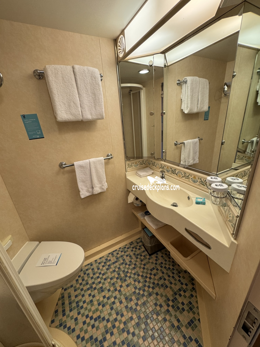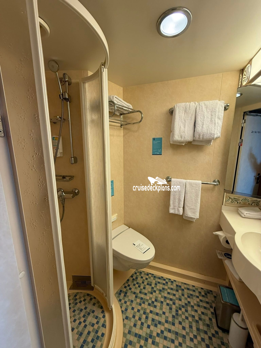 Bathrooms in standard staterooms are approximately 3' x 5'8". Shampoo, conditioner and soap are supplied in suites. Shampoo and soap are supplied in standard staterooms. Showers are European telephone style, adjustable from 1.4 m to 1.9 m, or 6'2", max. clearance height. Someone taller than 6'2" will fit in the shower, but will likely have to duck to get his or her head under the running water. Shower stools and nonslip mats are provided upon request.
