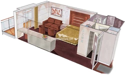 - Two-floor stateroom- Main Floor: Open living and dining room with sofa that converts to double bed