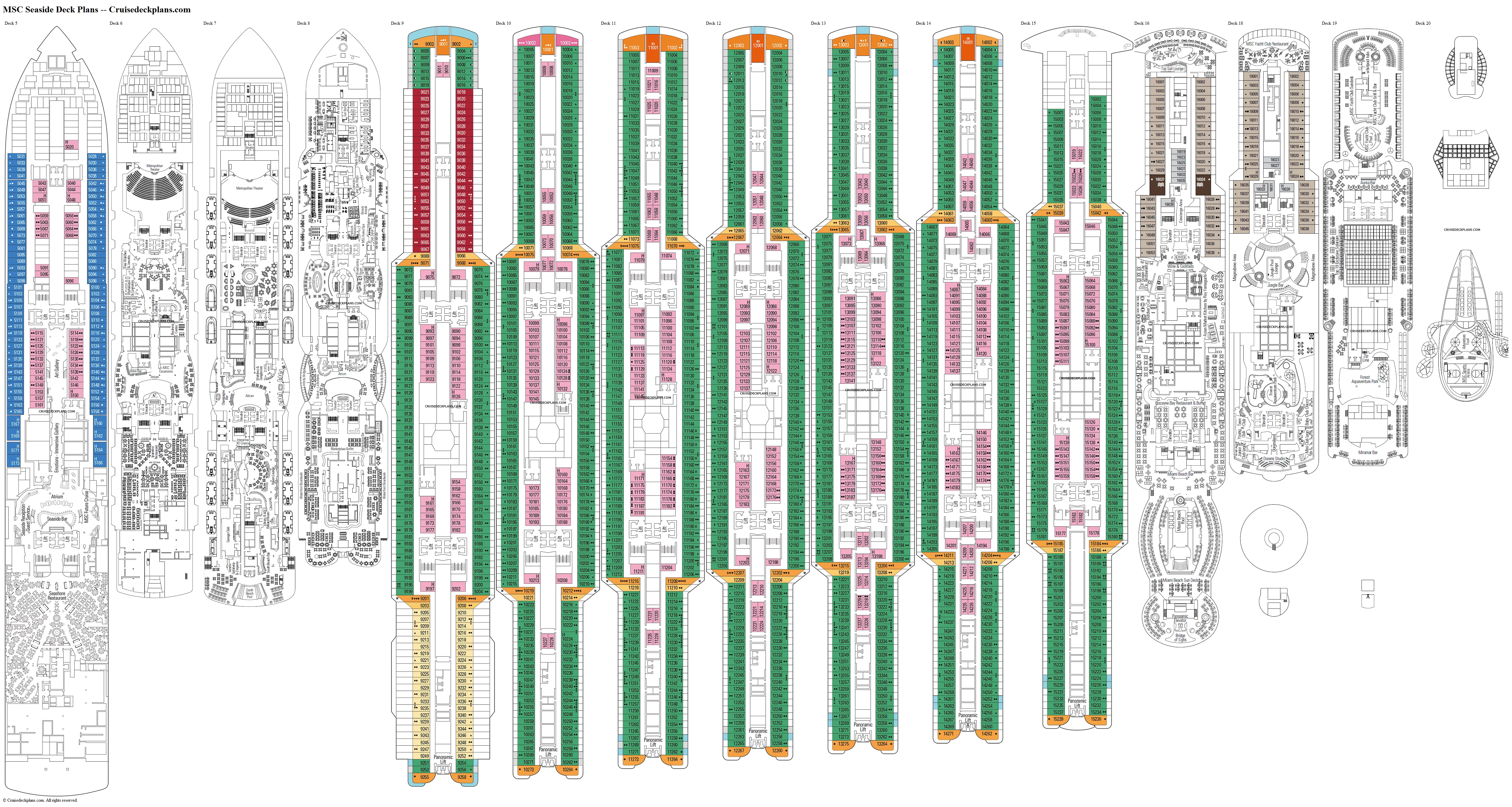 Built in 2017, the MSC Cruises MSC Seaside internal volume is 154K tons and has 2067 staterooms for up to 4961 passengers served by 1413 crew. There are 19 passenger decks, 10 with cabins. You can expect a space ratio of 31 gross tons per passenger on this ship. On this page are the current deck plans for MSC Seaside showing deck plan layouts, public venues and all the types of cabins including pictures and videos.