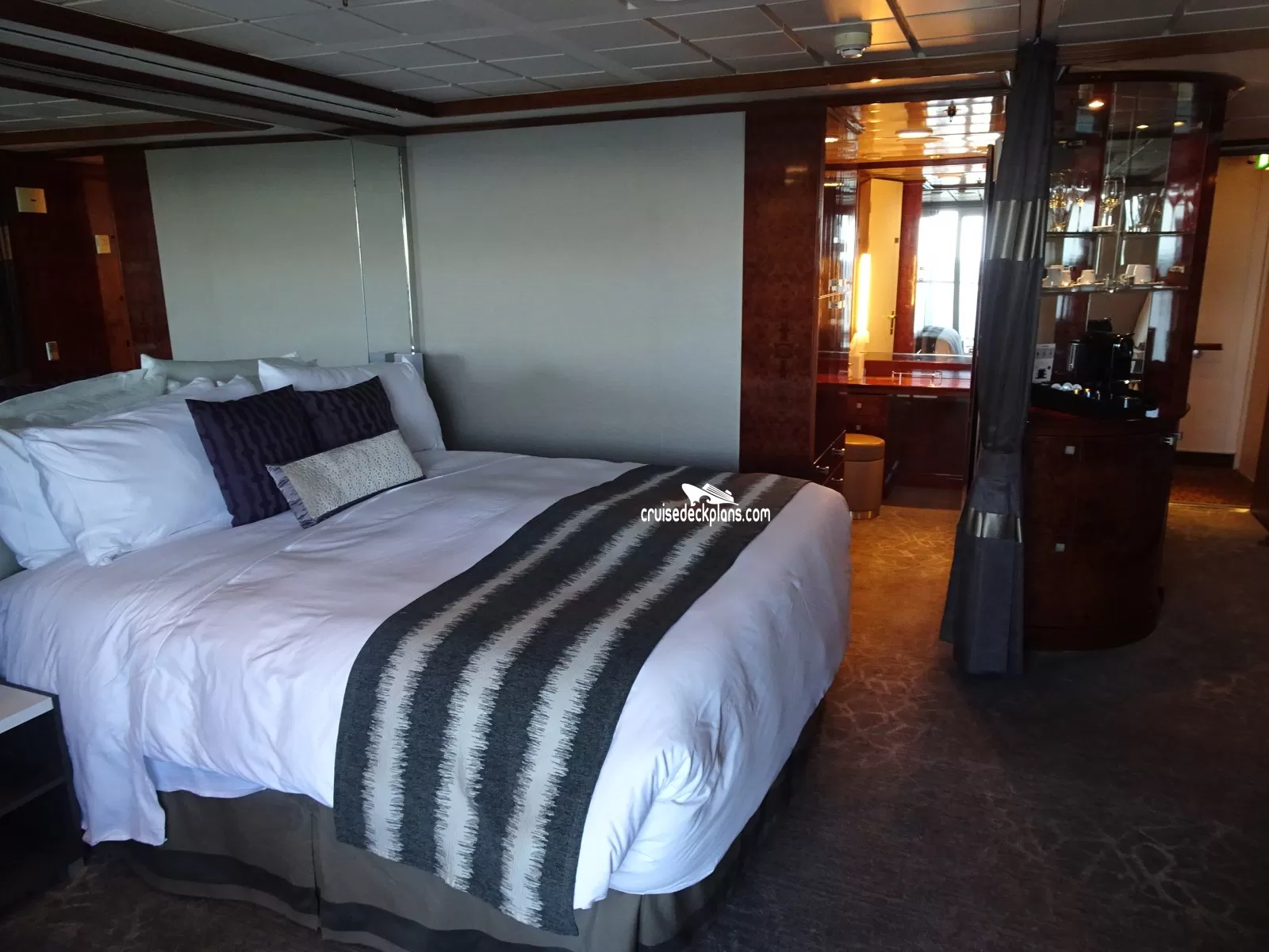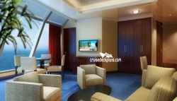 Butler Service / Concierge Service / Priority Check In / Priority Debarkation / Priority Tender Boarding / Welcome Champagne / Thick Cotton Robes / Pillow Menu / Espresso & Cappuccino machine / Special suite menus / Bliss collection pillow-top mattress / Treats delivered to door every night /Each suite can be interconnected to a studio suite and balcony cabin.Amenities also include white tablecloth in-suite dining, priority reservations for the ship\'s specialty restaurants, spa and entertainment venues, Distinctive key card, butler available to unpack luggage, bottled water, full in-suite breakfast menu, breakfast and lunch at specialty restaurant, fresh flower arrangement, and plush slippers and towels.