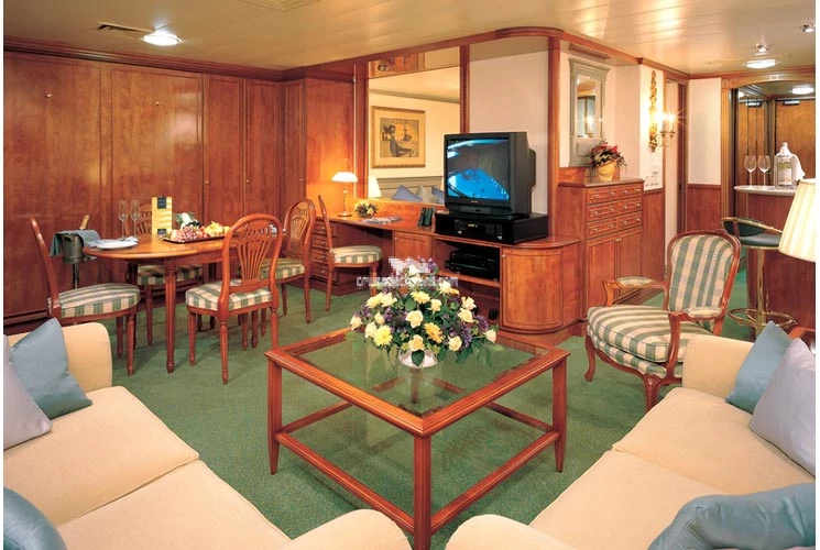 Butler Service / Concierge Service / Priority Check In / Priority Debarkation / Priority Tender Boarding / Welcome Champagne / Thick Cotton Robes / Pillow Menu / Espresso & Cappuccino machine / Special suite menus / Bliss collection pillow-top mattress / Treats delivered to door every night /Category AC comes with a whirlpool bath.Amenities also include white tablecloth in-suite dining, priority reservations for the ship\'s specialty restaurants, spa and entertainment venues, Distinctive key card, butler available to unpack luggage, bottled water, full in-suite breakfast menu, breakfast and lunch at specialty restaurant, fresh flower arrangement, and plush slippers and towels.