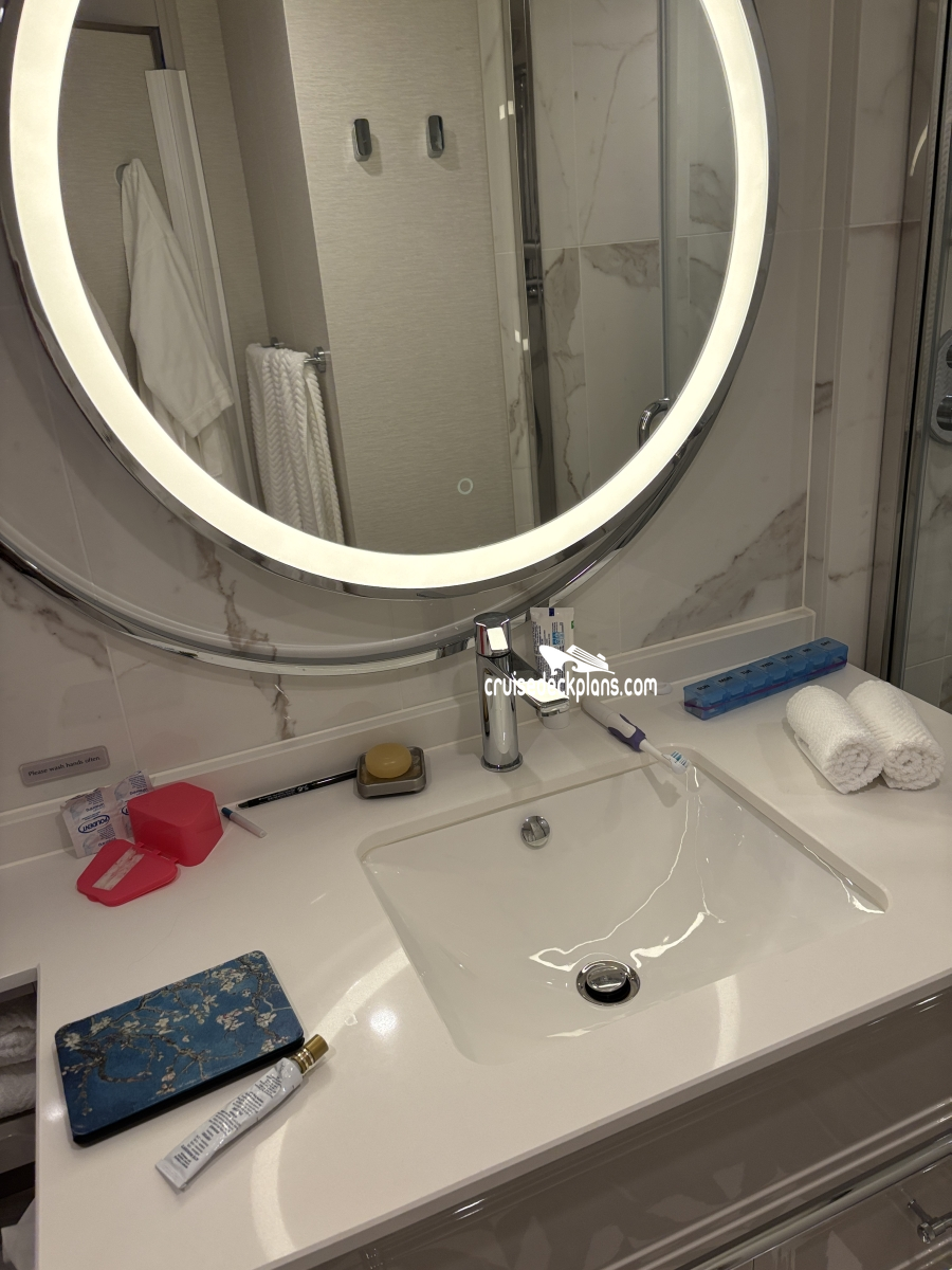 Thick Cotton Robes / Queen-size Prestige tranquility bed with 1,000 thread count linens / Refridgerated mini-bar with free and unlimited soft drinks and bottled water / Bulgari toiletries / Full-size bathtub / Signature belgian chocolates with nightly turndown service / DVD player / Wifi / Stationary /Amenities also include slippers, Cashmere lap blanket, wireless laptop computer, services of dedicated Concierge, welcome bottle of Champagne, access to exclusive Concierge lounge. Priority restaurant reservations at Polo Grill, Toscana, Jacques and Red Ginger. Complimentary Tote Bag. Priority embarkation and luggage delivery, complimentary shoe shine, complimentary pressing of garments upon embarkation (some limits apply).